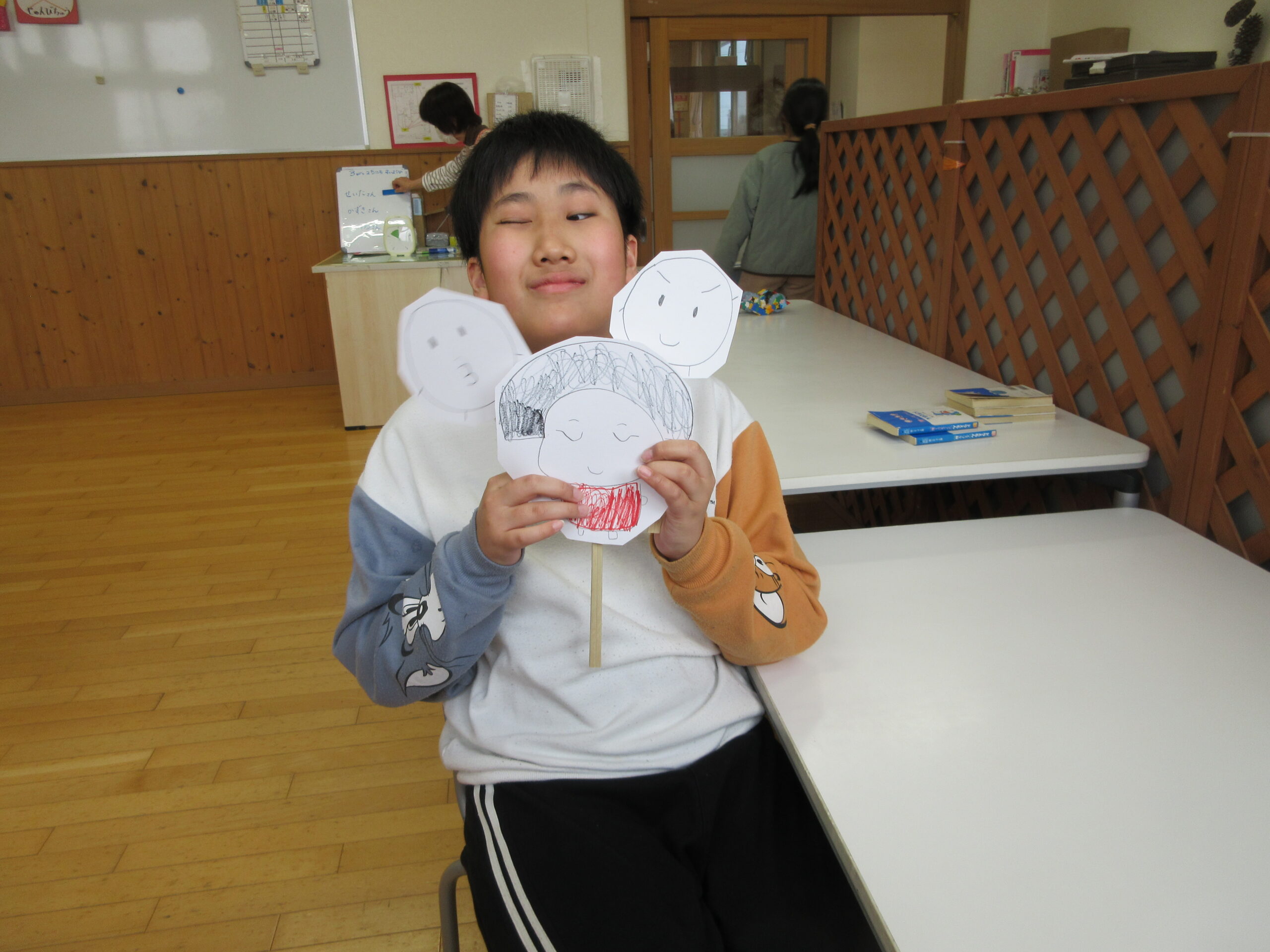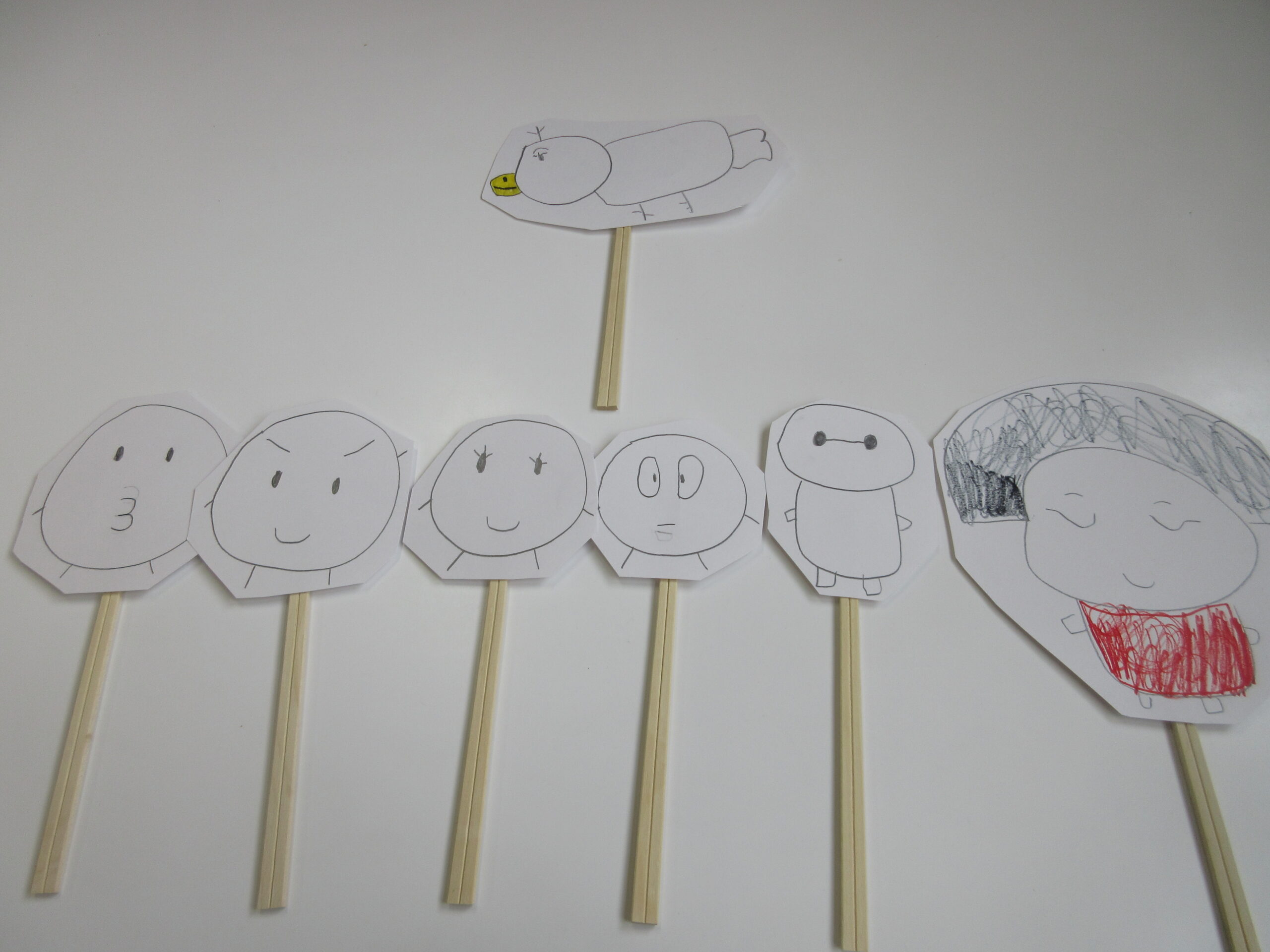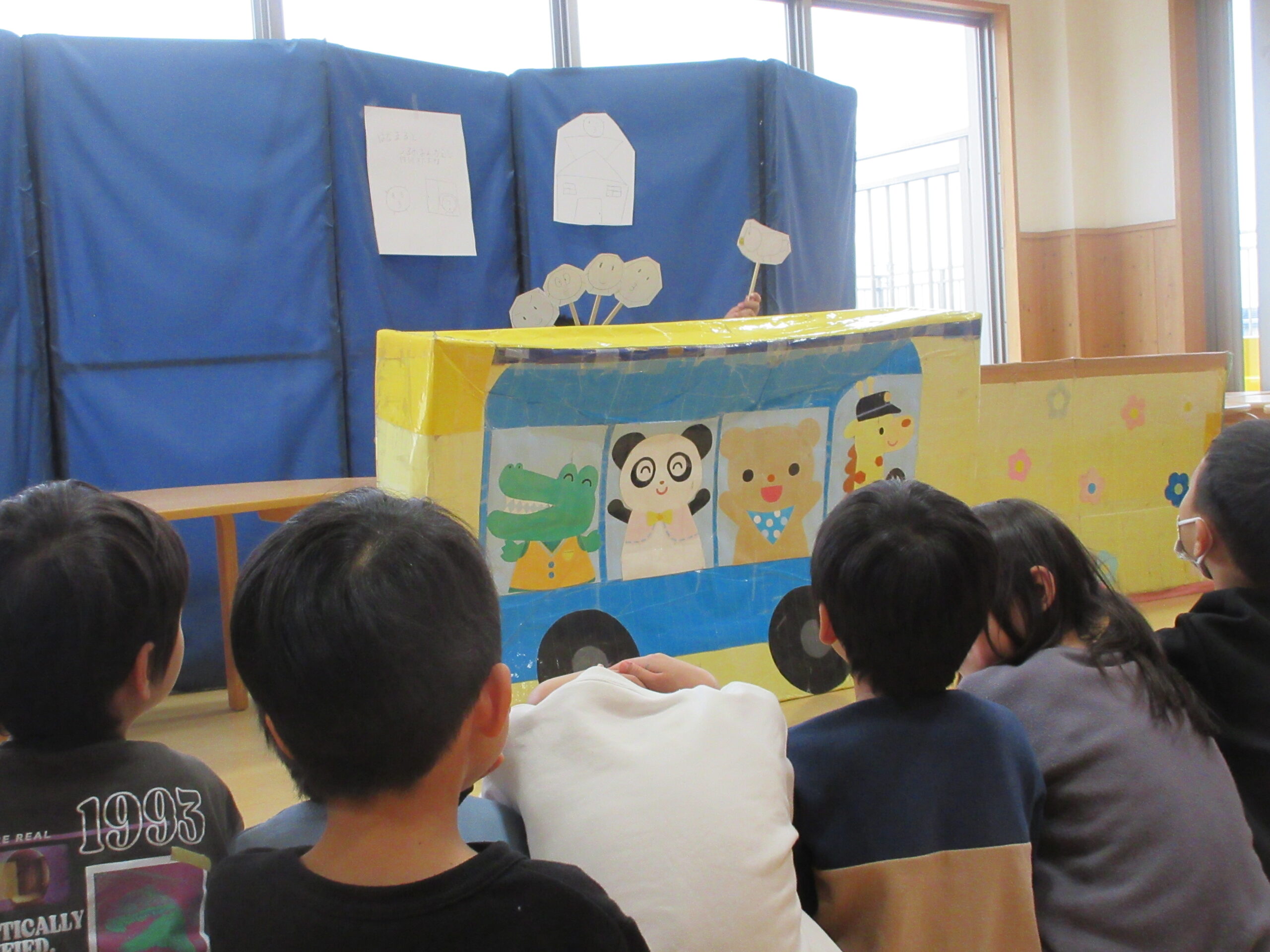 自作のストーリーでペープサート劇を年長のお友だちに見せてくれました。