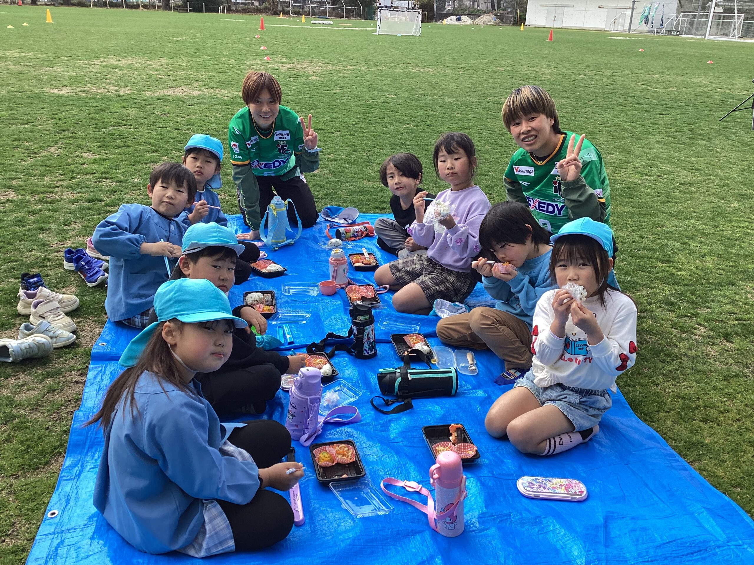 FCくノ一のグラウンドに行かせてもらい、神戸保育所の友だちと一緒にサッカー教室に参加しました。 芝生の広いグラウンドの端から端まで走る姿に、“やるぞ~!”という気持ちが伝わってきました。 終わってからは、給食をパックに詰めてもらってお弁当タイムでした。 「めっちゃ、おいし~い」 お土産もいただきありがとうございました。