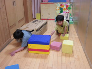 ダンボール箱やスポンジ積木を使ってミニサーキットを作りました。
