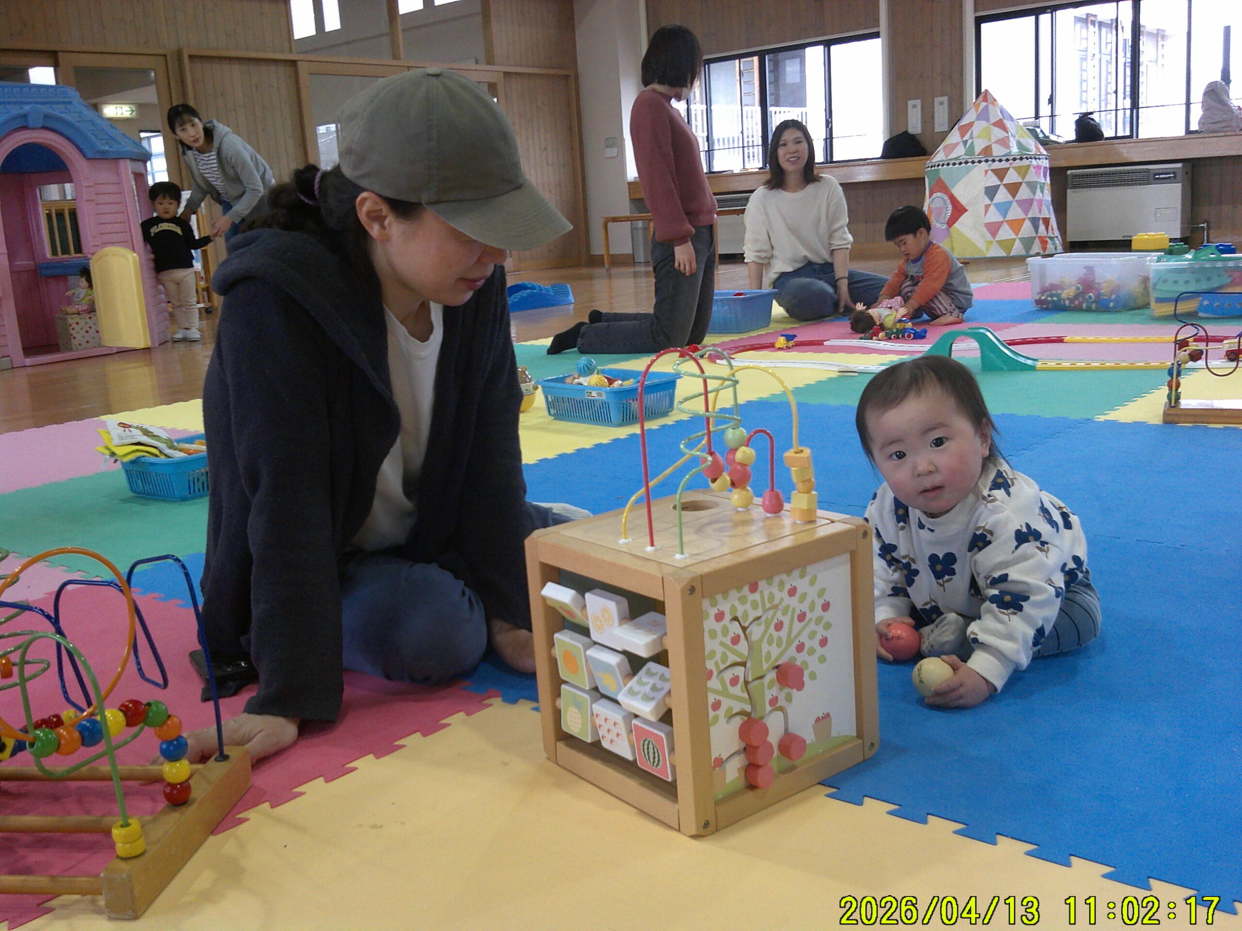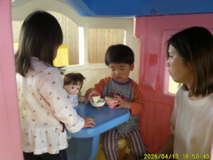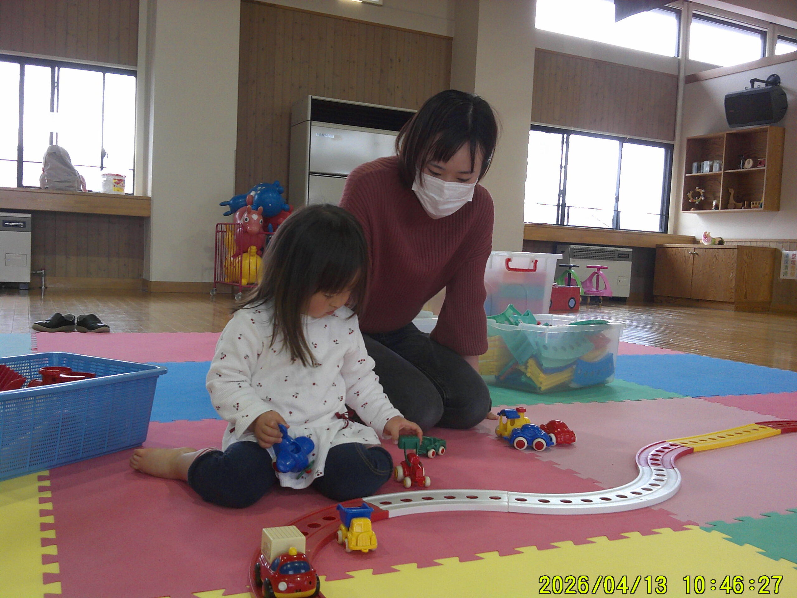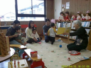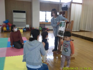 令和8年度すくすくらんどが始まりました。 親子でふれあいあそびをしたりおもちゃで遊んだり楽しく遊びました。 今後も楽しい内容を企画しています。是非遊びに来てくださいね。 「はいどうぞ」 「もこもこ」さんによる絵本の読み聞かせ