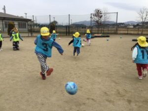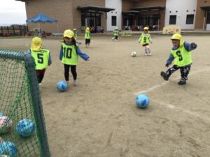 ⚽ チームに分かれて、サッカーあそびを開始😊 ゴールに向かって、ボールをシュート!!