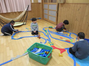 「一緒にしよう」と友だちを誘って、線路を繋げていました。