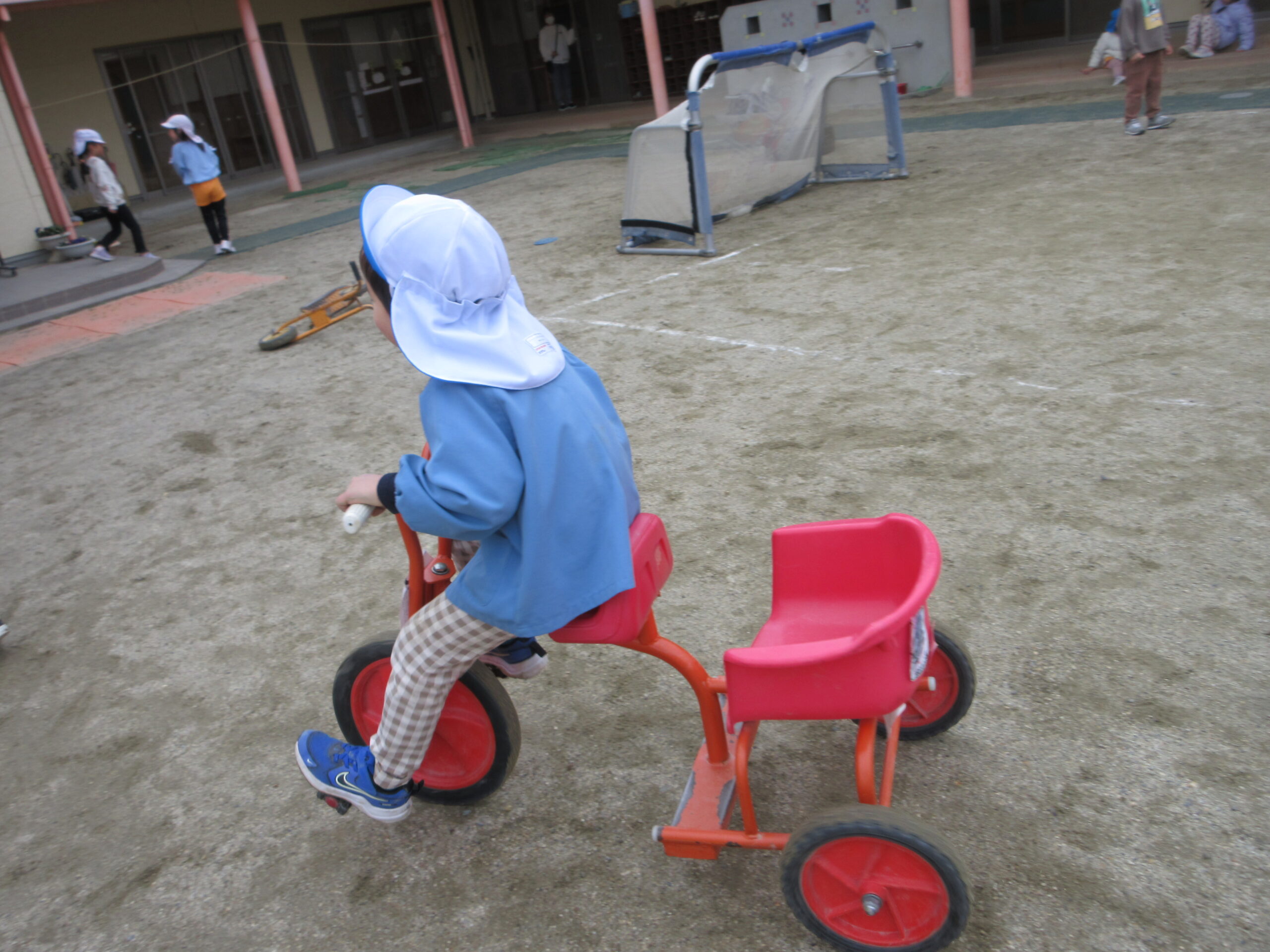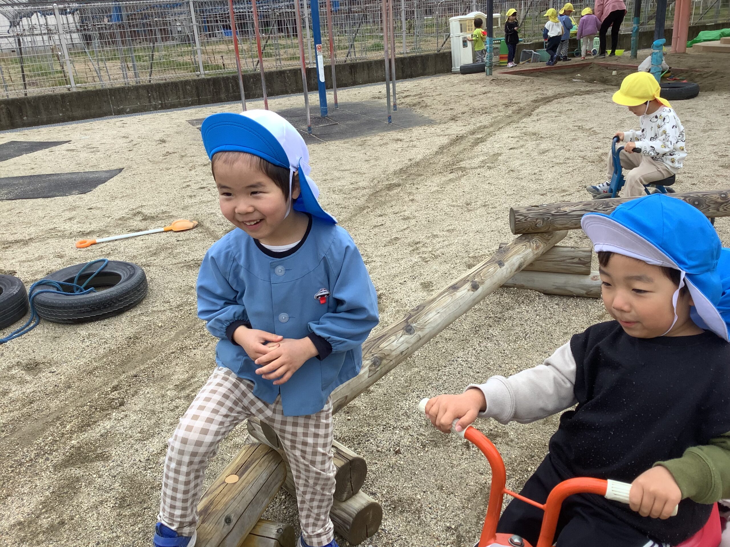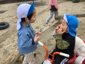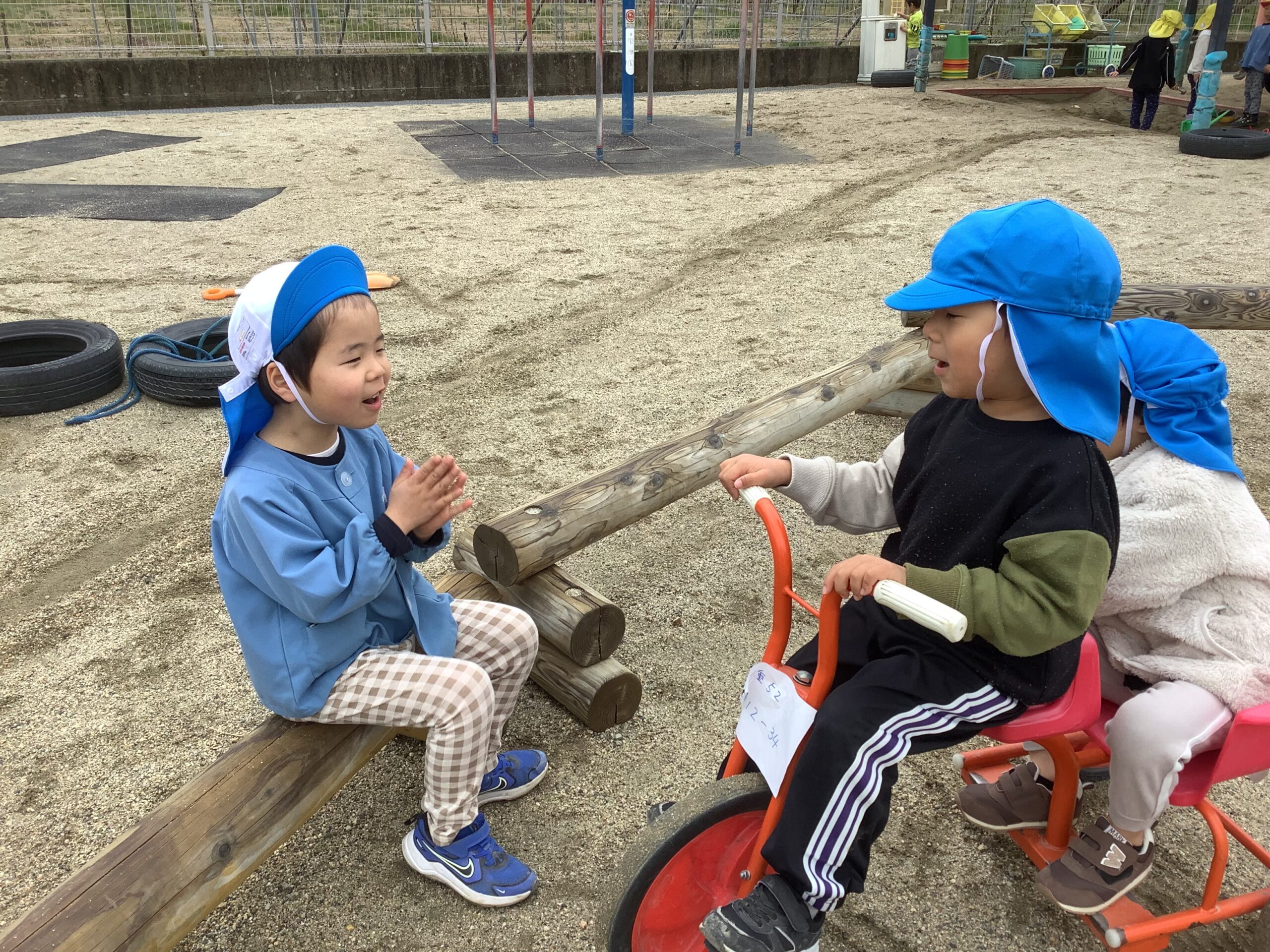 三輪車に乗ってる青い帽子の子に、白い帽子の子が「変顔対決で、ぼくが勝ったら代わって」と対決を挑んだようです。見ていた保育士が写真を見せてくれました。