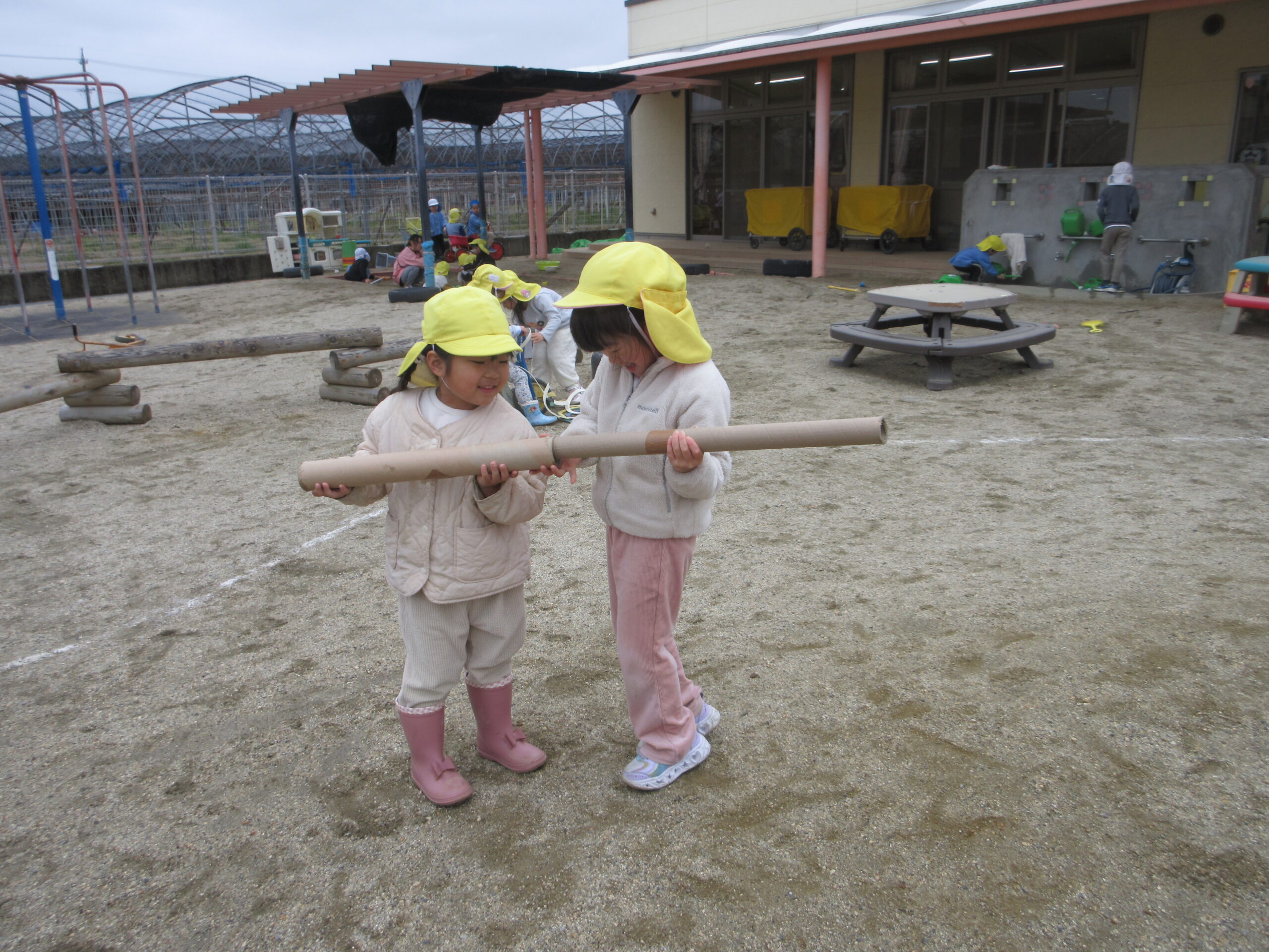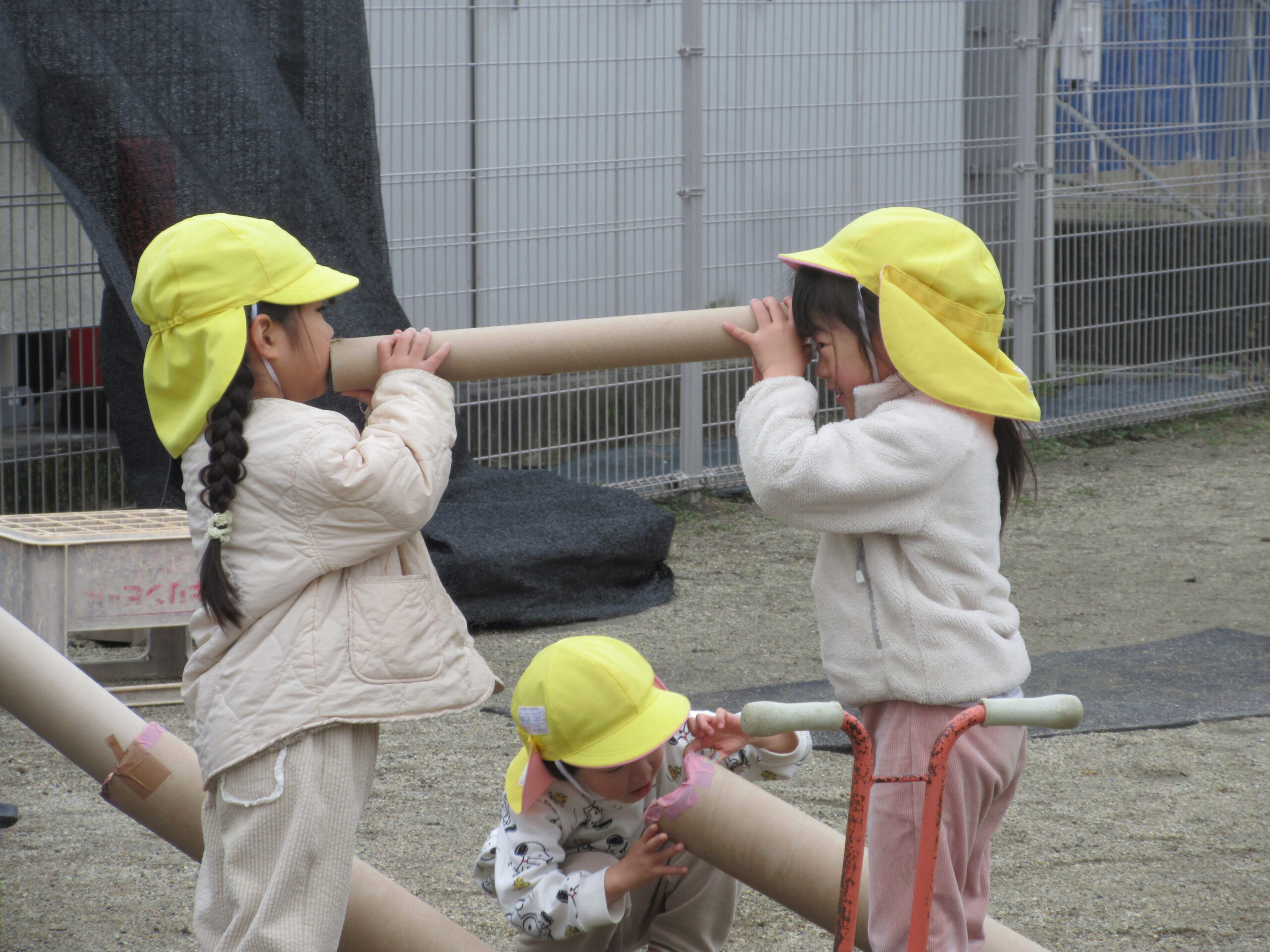 10分くらいの間の出来事です。気の合う友だちと夢中になって筒で遊んでいるので、近くにいる私には、まったく気づいていません。二人の楽しげな様子を見ている私も楽しい気持ちになりました。