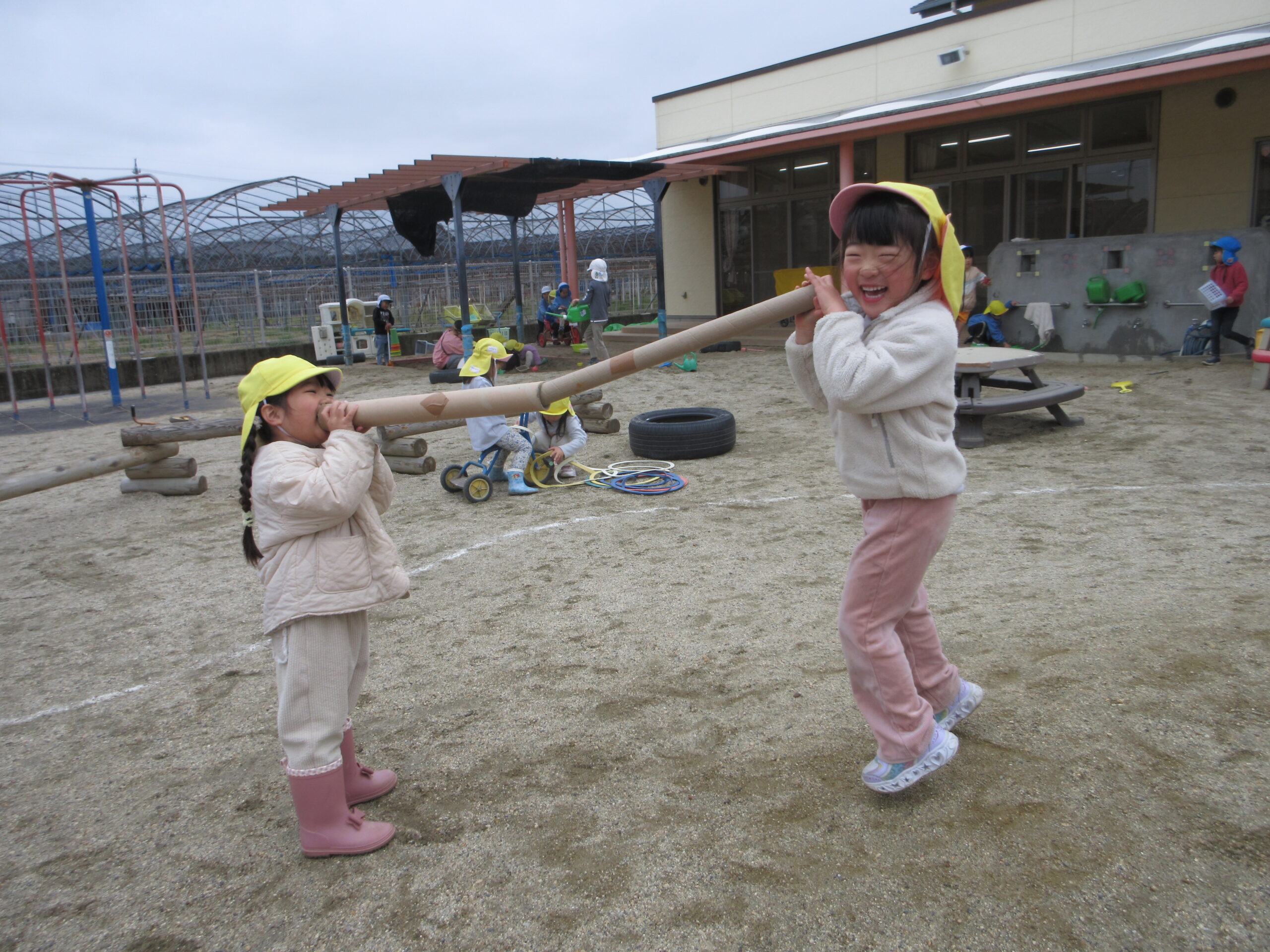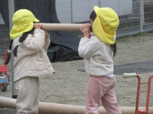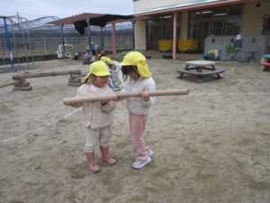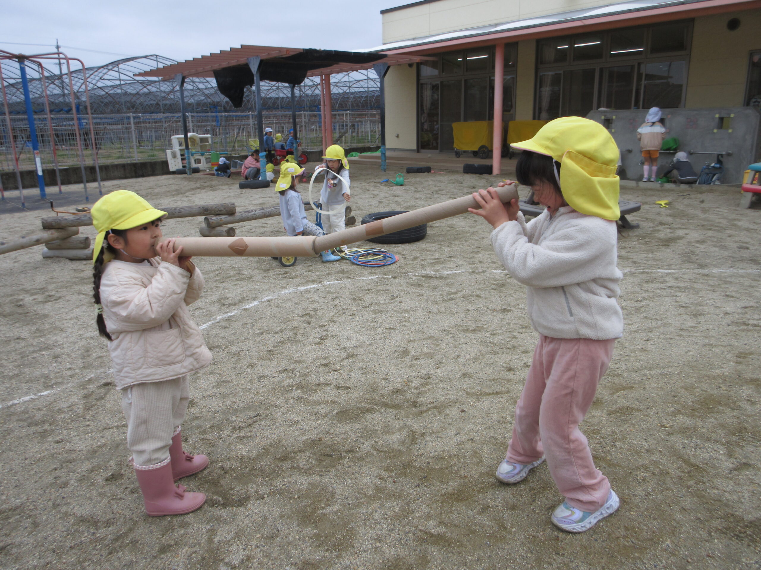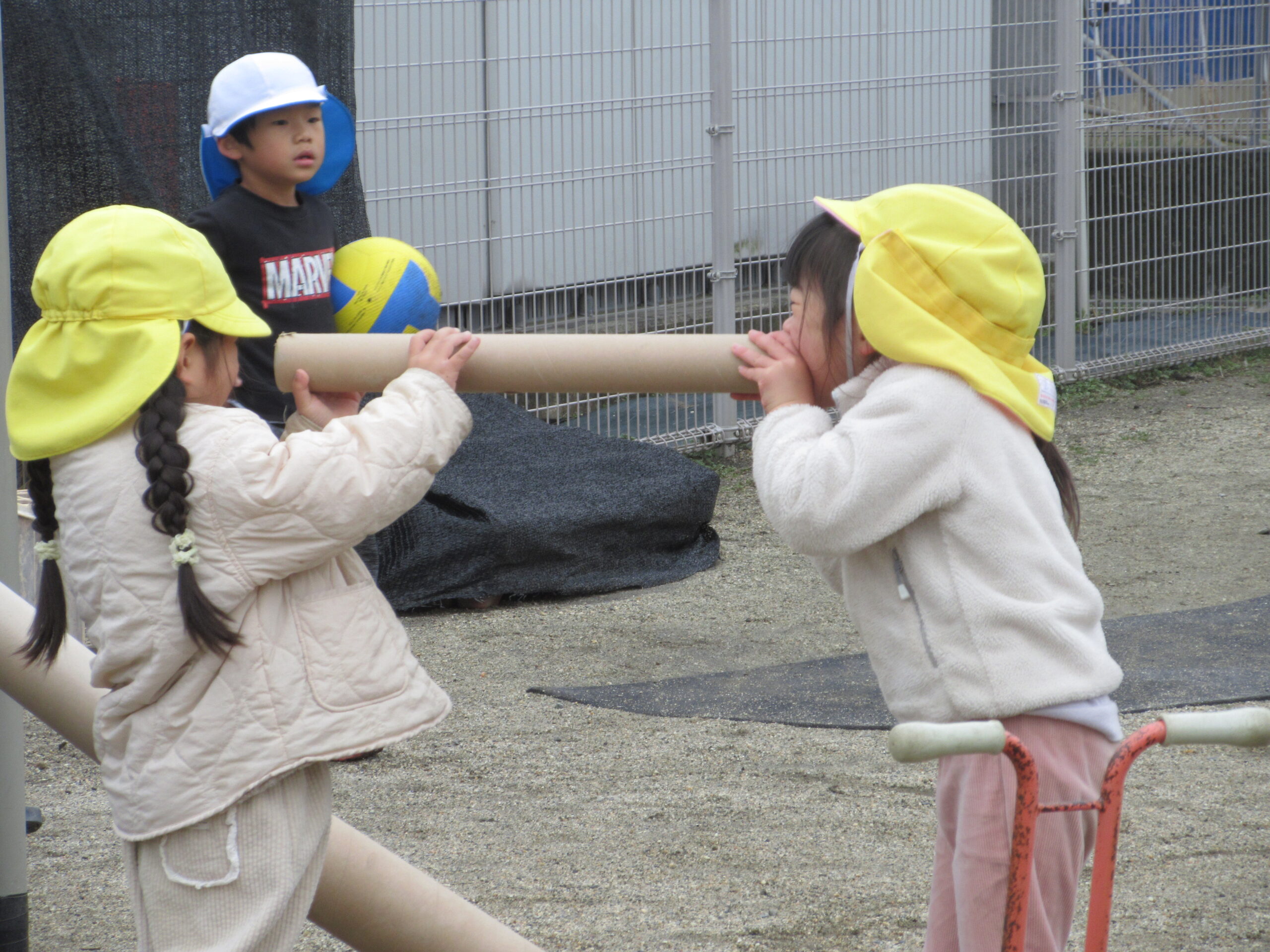 二人が筒の特徴を活かして、楽しく遊んだことは学びの多いことだと思います。そして、その遊びを二人でキャッキャ キャッキャと言いながら一緒にやったことにも大きな意味があると思います。