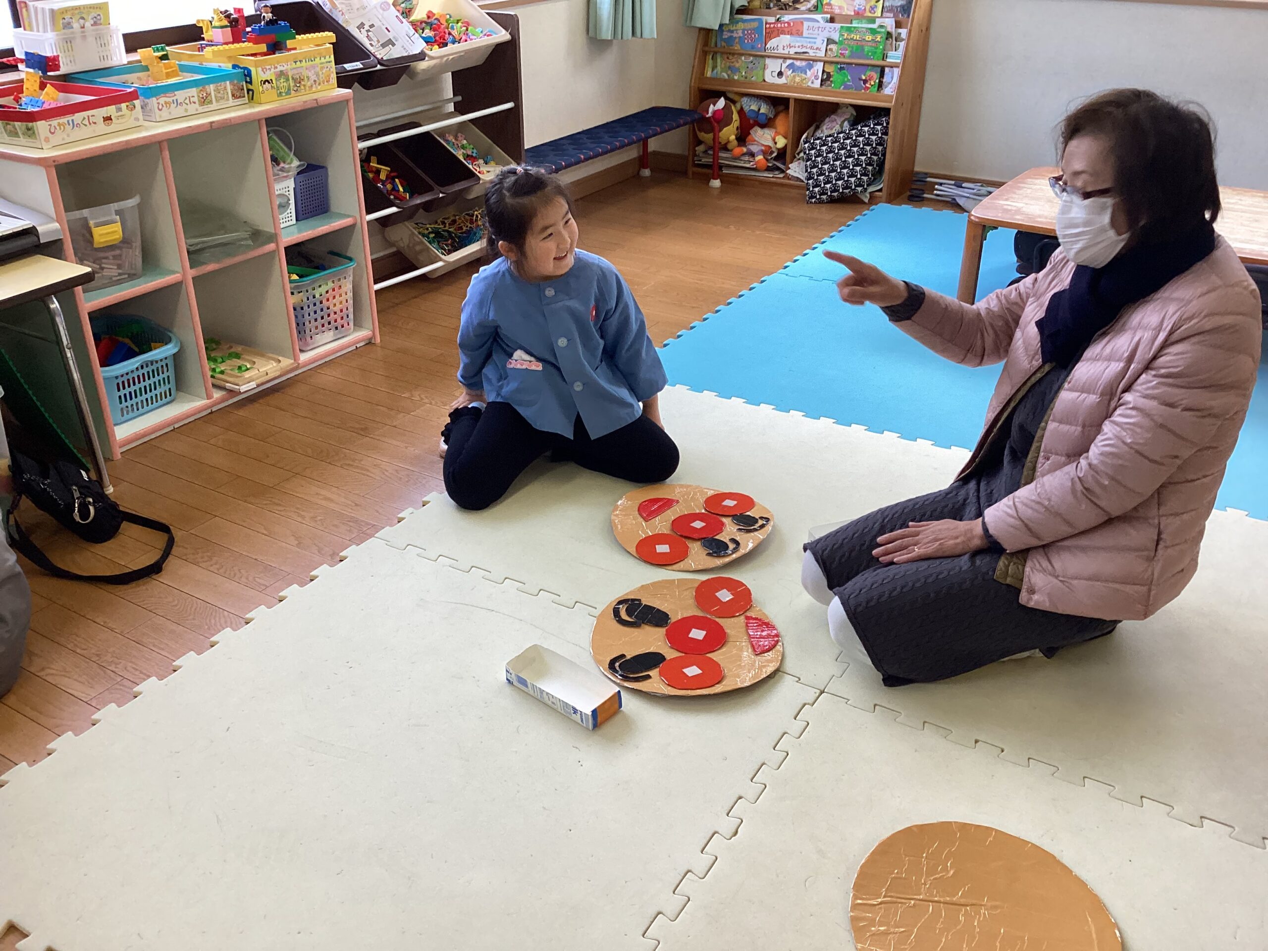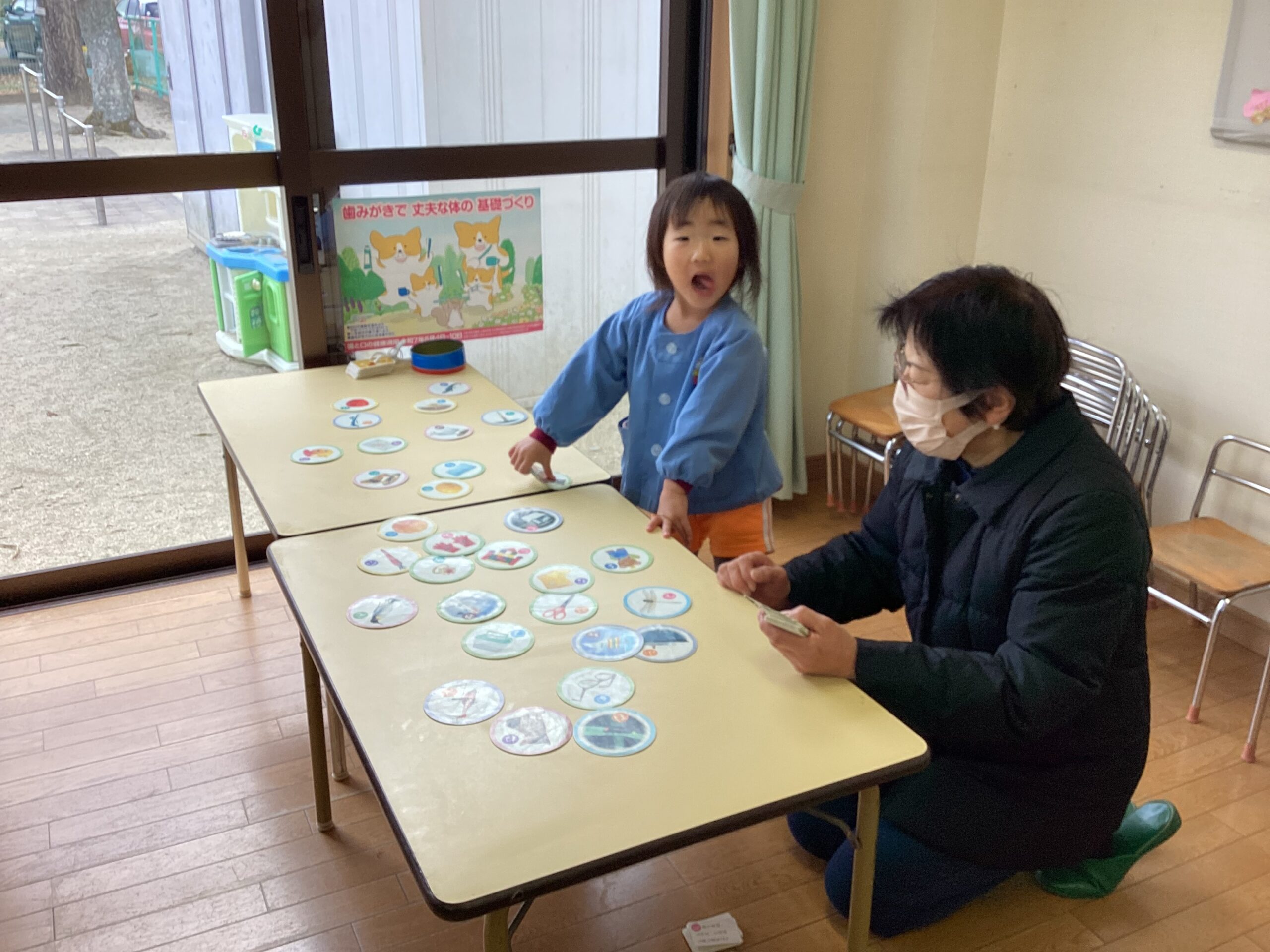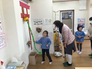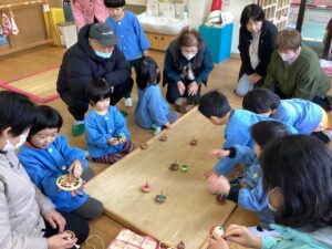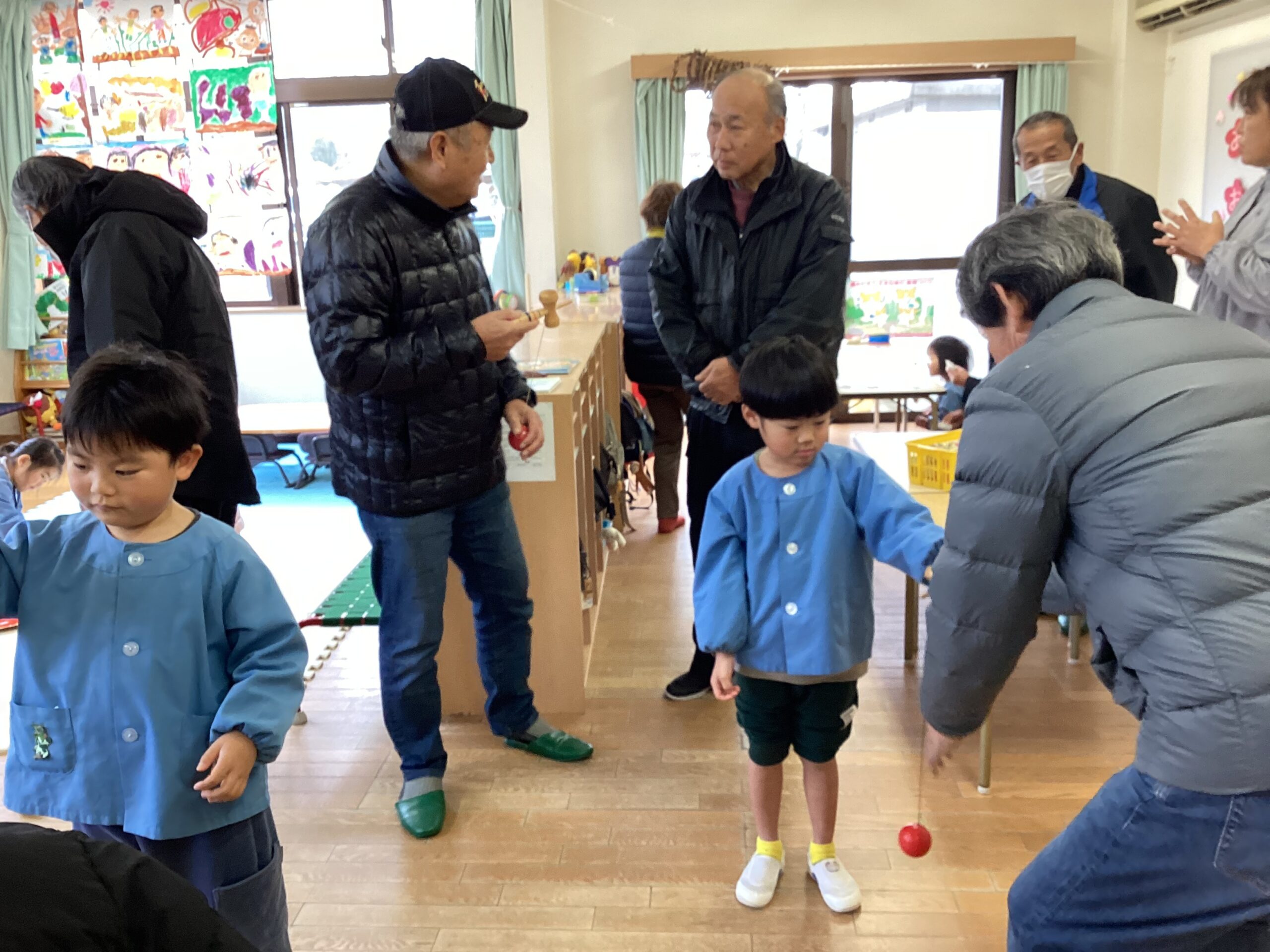 なかなかうまくいかないこま回しやけん玉のコツを教えてもらいました。