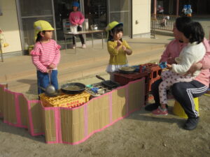 「わたしもしよう」と、もう一人やってきました。両隣の子の様子を見ていたので、「オムライスやさんとラーメンやさんだって」と伝えると、「じゃあ、カレーやさんにするわ。」と決めました。