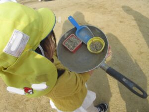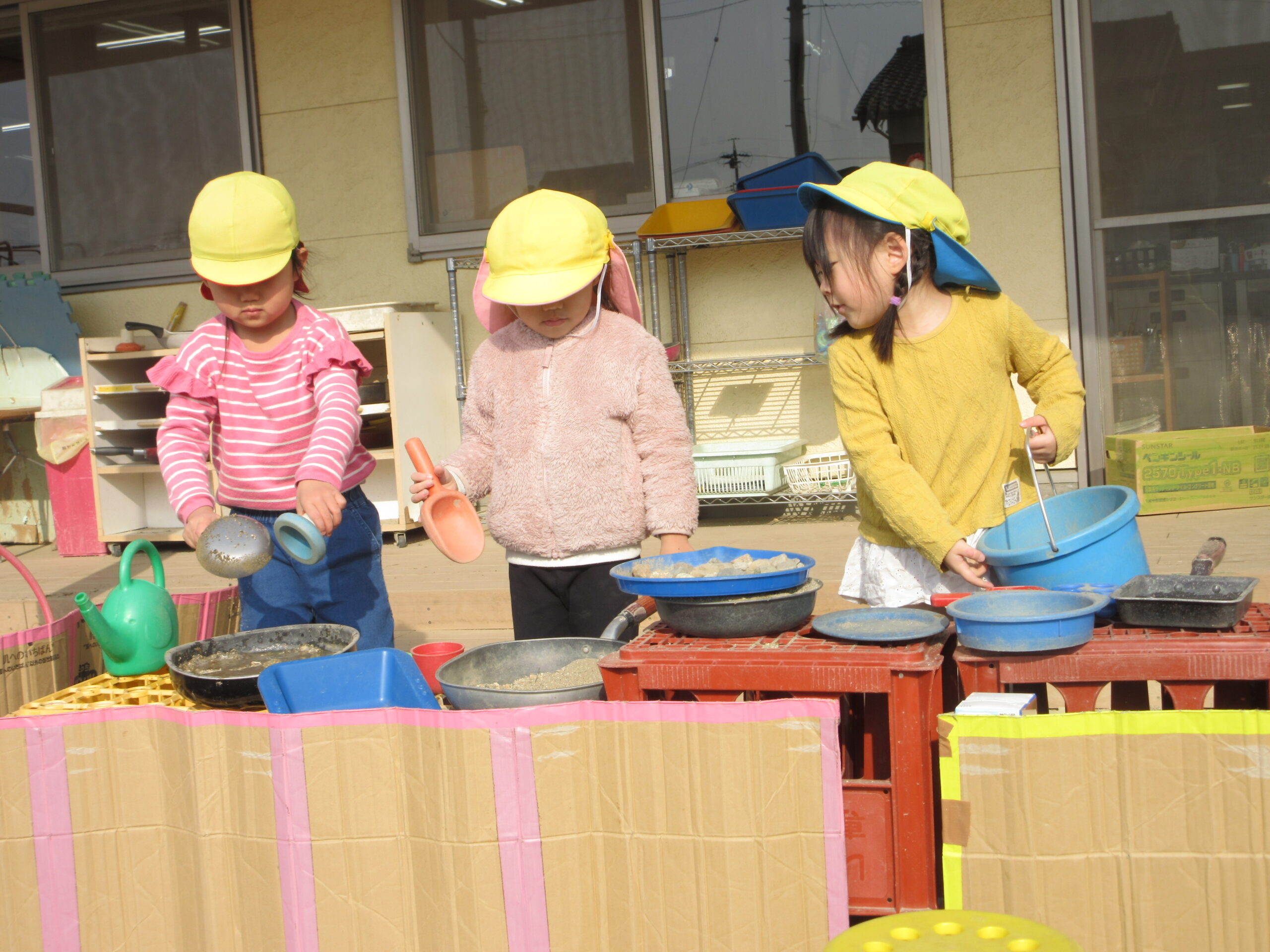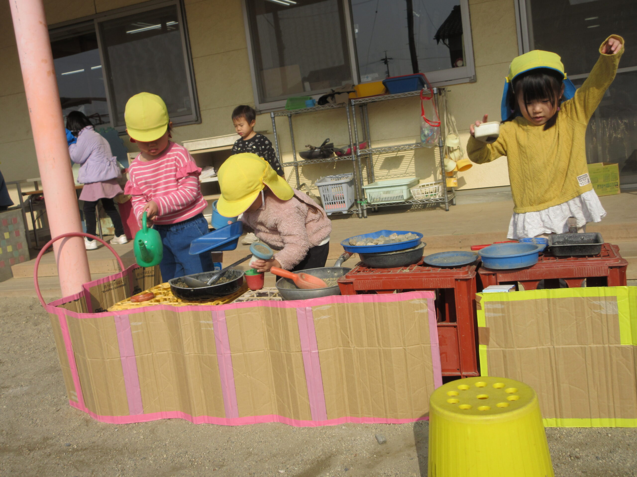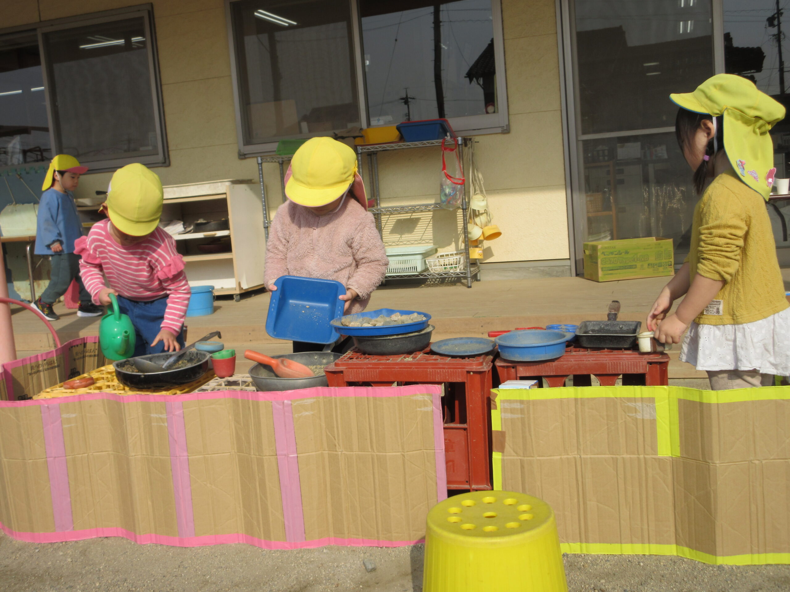 3人が並んで料理をしている様子は、レストランごっこのようですが、そうではなく、フードコートのようなイメージです。交わっているようで、交わっていません。でも、お互いのことはとても気になっているので同じようにしてみたり、使っているものを共有したりしています。「デザートあります」とそれぞれが声を上げる姿は、相手がいる場で自分(の考え)を出そうとしている成長のあらわれです。「これつけて」と渡された紐は、フードコートの呼び出しベルと言ったところでしょうか。生活の中での経験がいかされています。(それにしてもしっぽ取りの紐を使うとは、子どもの自由な発想にはいつも驚かされます。)なかなか料理が出来上がらないのは、お客さんに振る舞うよりも、“料理をする”それ自体が楽しいからなのでしょう。3歳児のあそびの面白いところです。