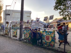 保育園は日曜日ですが、子どもたちの旗で応援しています。
