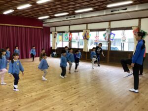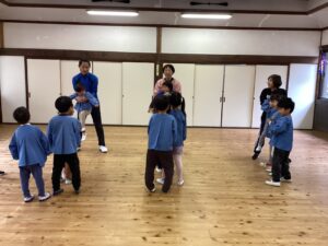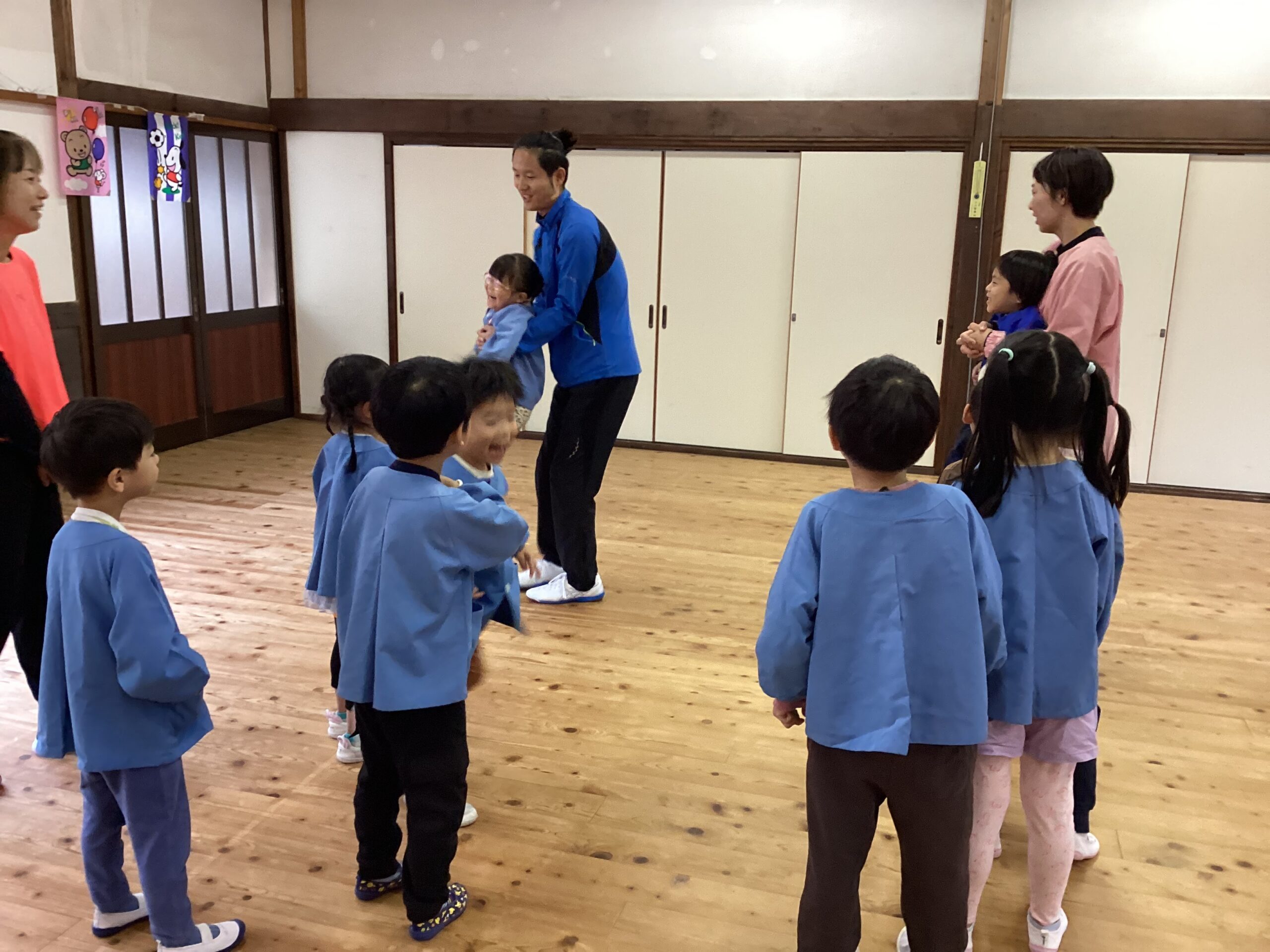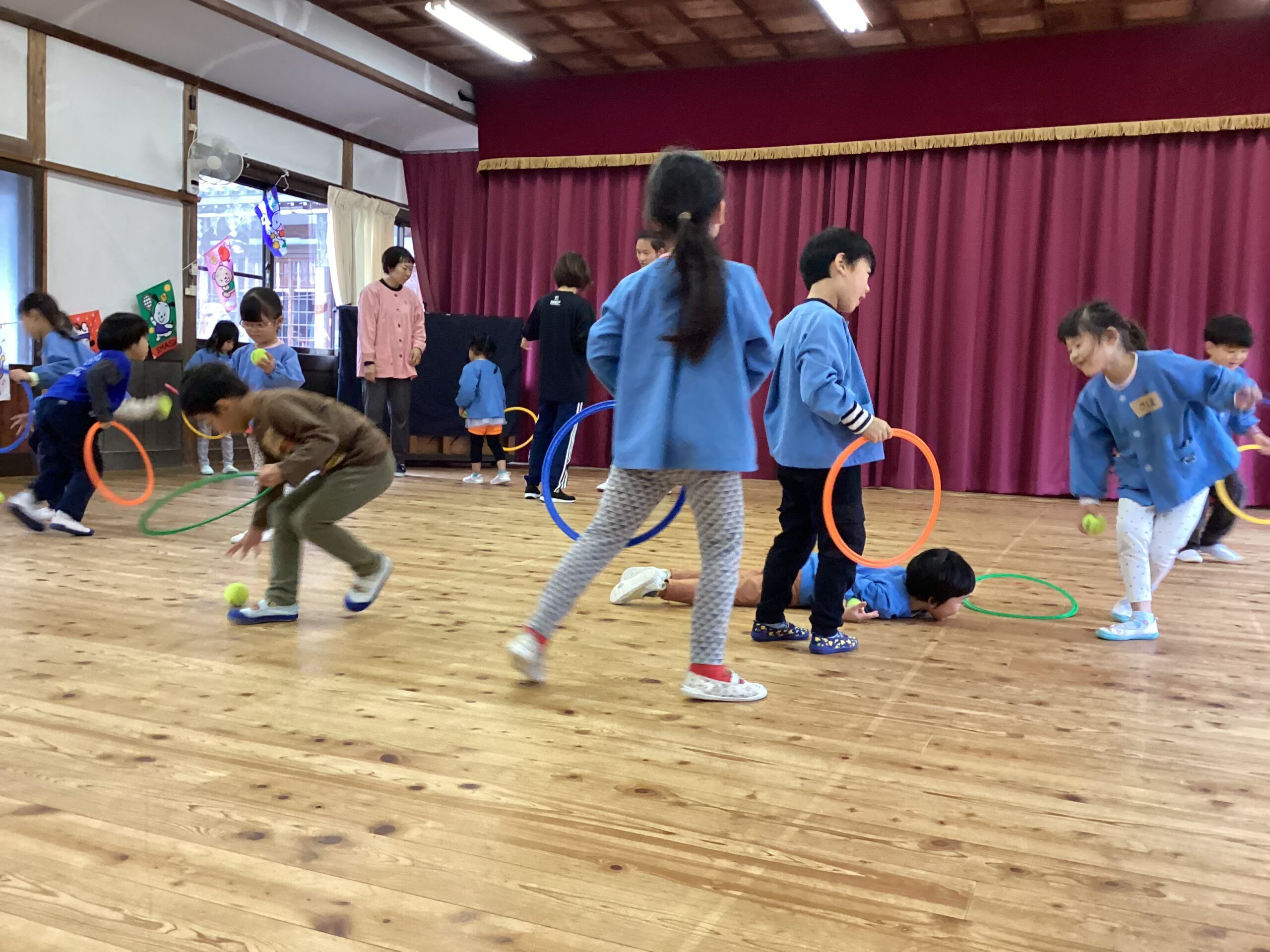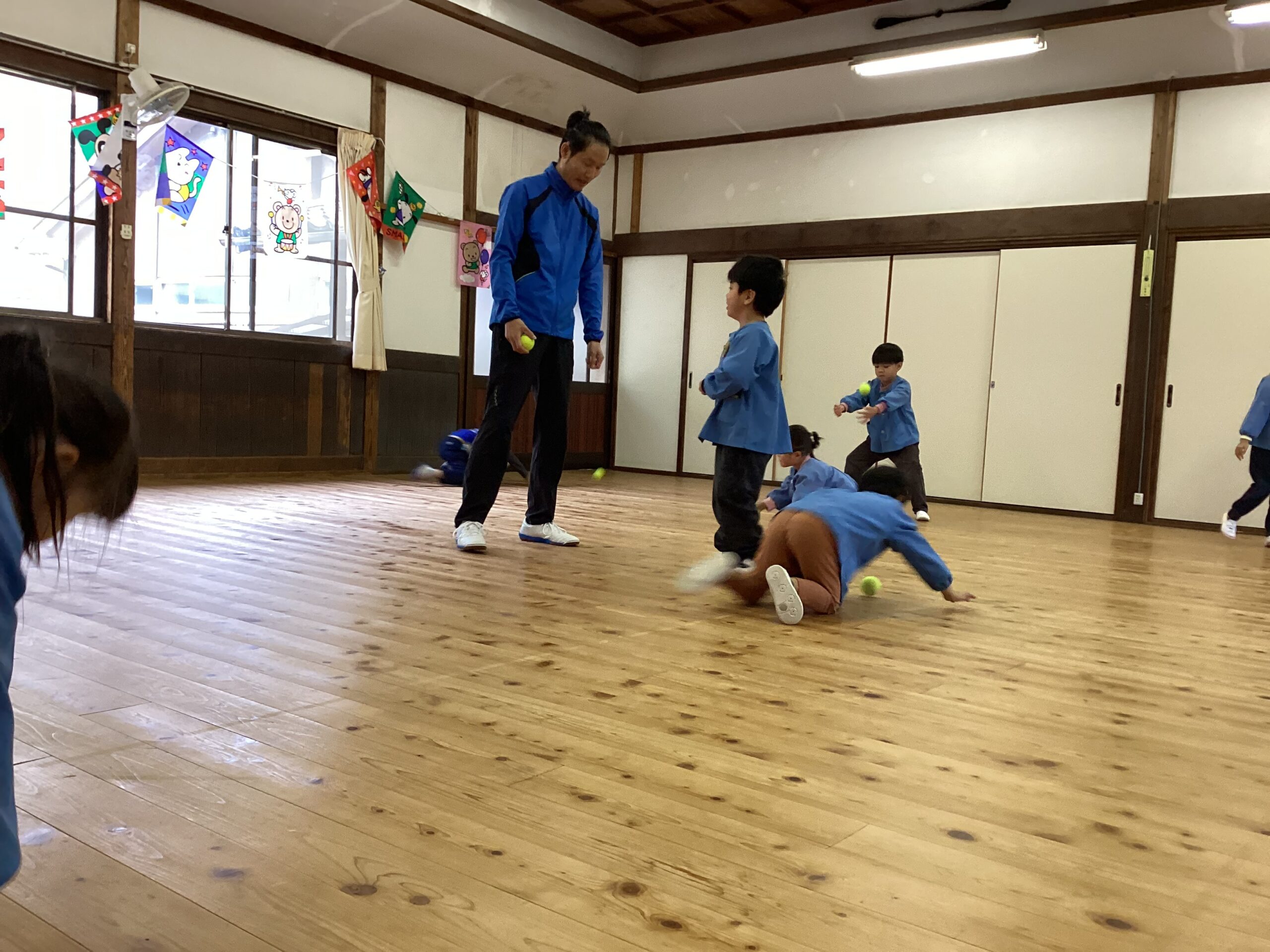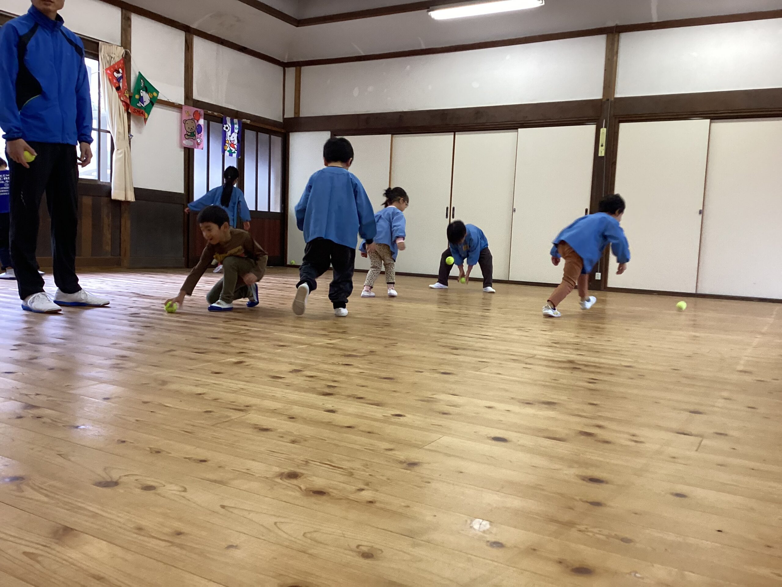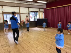 先日、講師の福永有貴さんの指導で年長児がコーディネーショントレーニングを体験しました。 「コーディネーショントレーニングはどんなことするのかな?」と楽しみにしていた子どもたち。 まずは準備体操、まねっこなど。 一人一つのテニスボール。うまくキャッチできるかな。転がってしまうよ~ フープでもテニスボールをキャッチ。 ムカデになって後ろの子をタッチ。なかなかむずかしい。 あー楽しかった。もっとしたいな。 ありがとうございました。