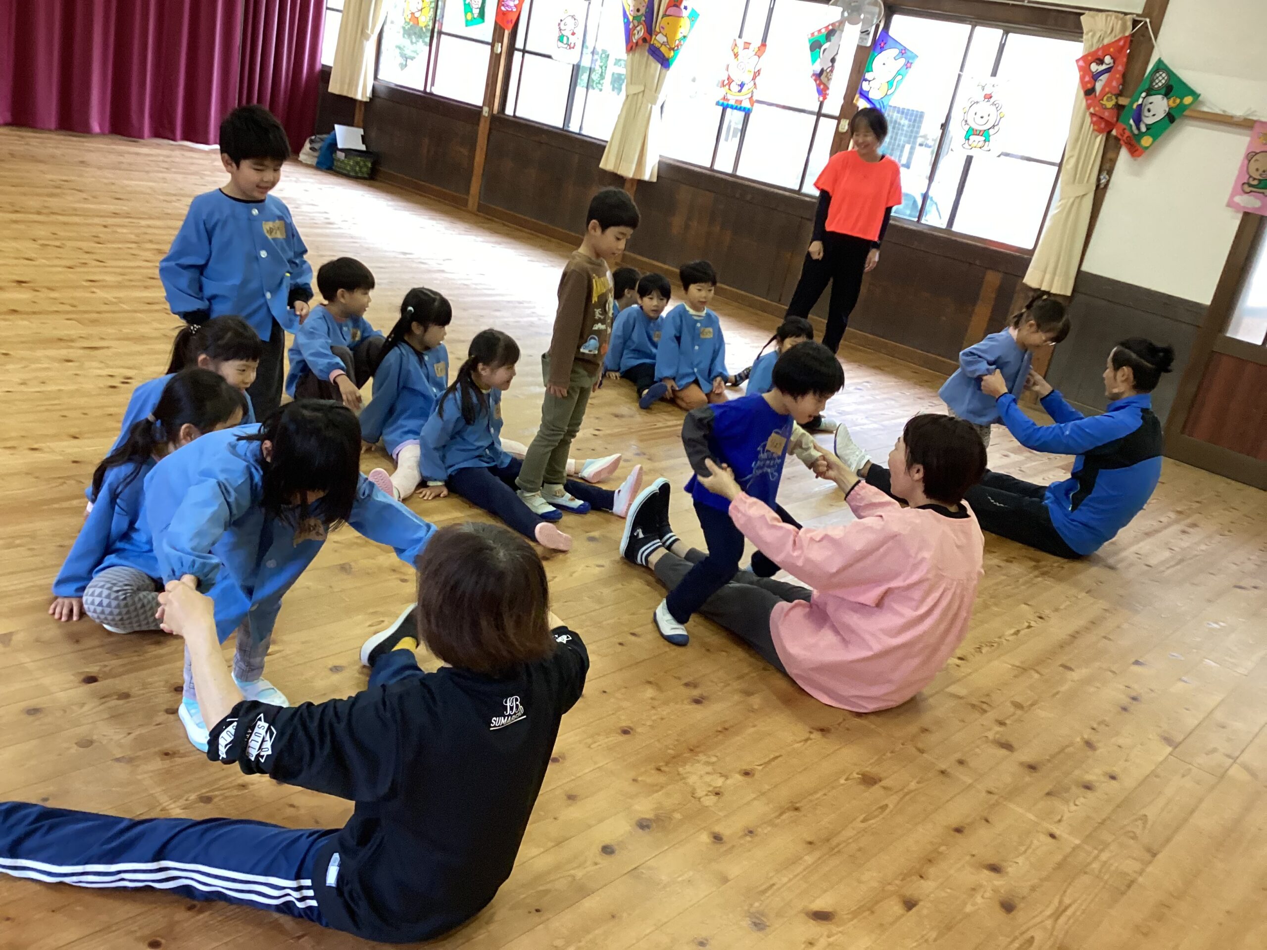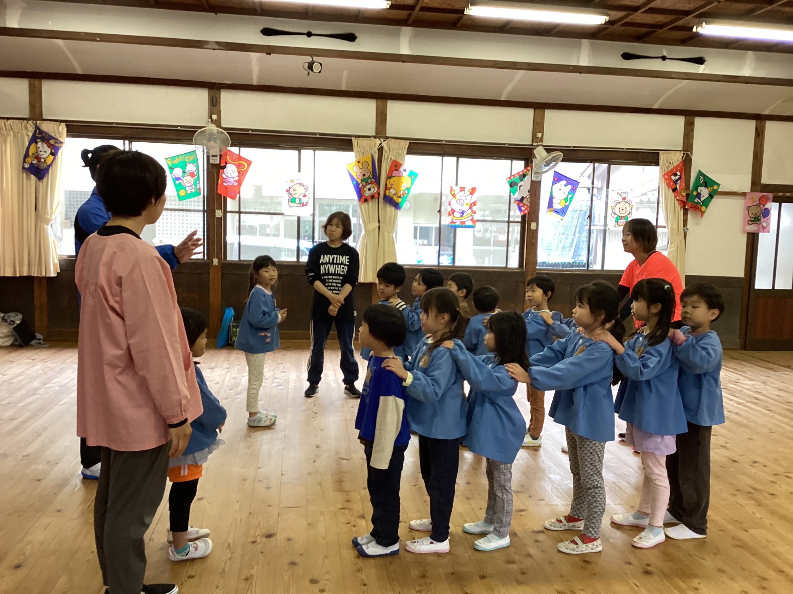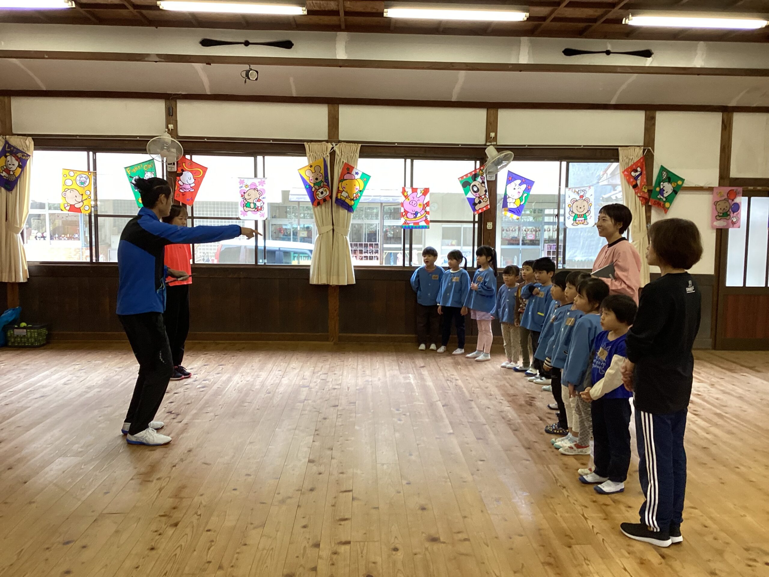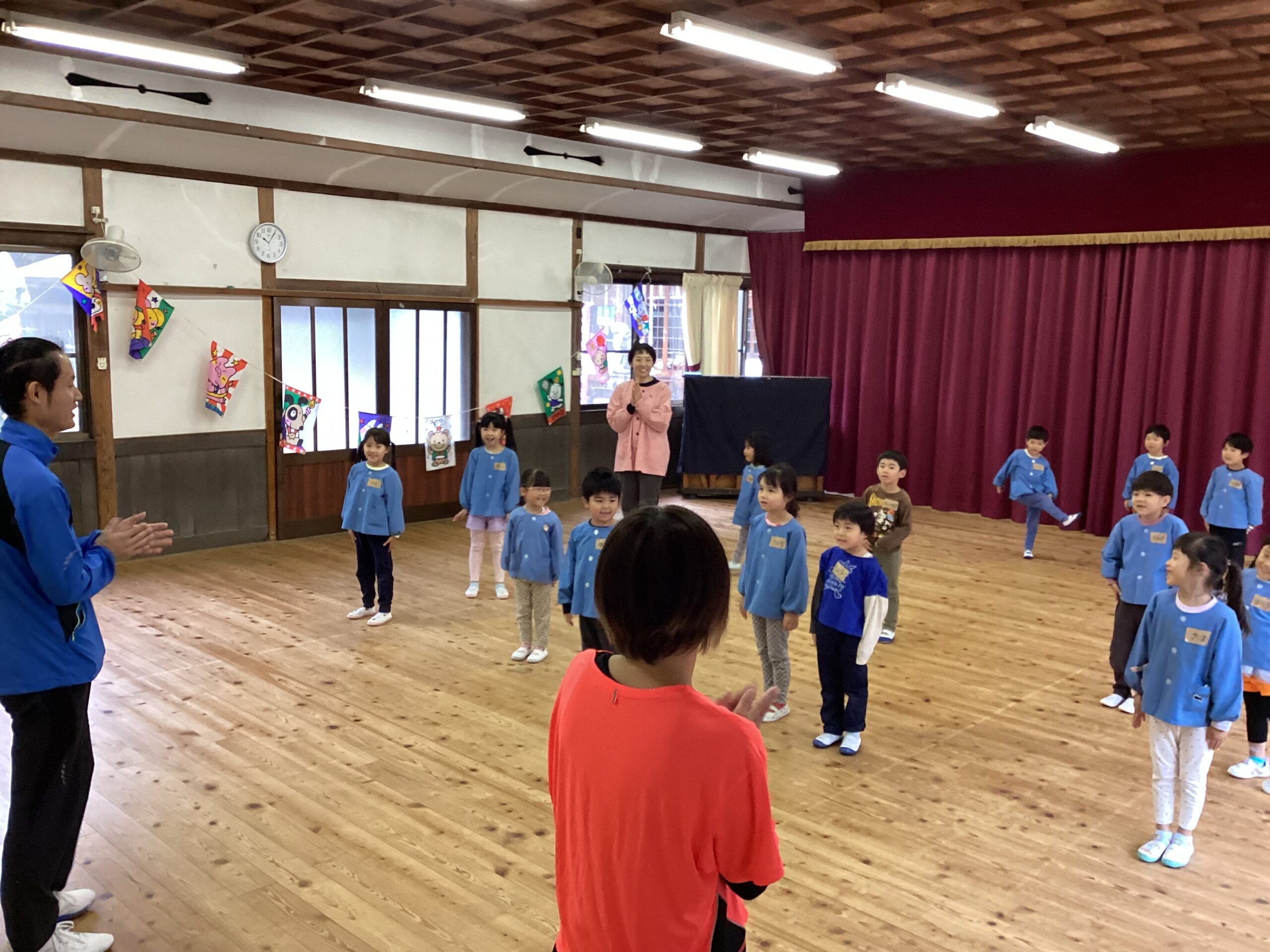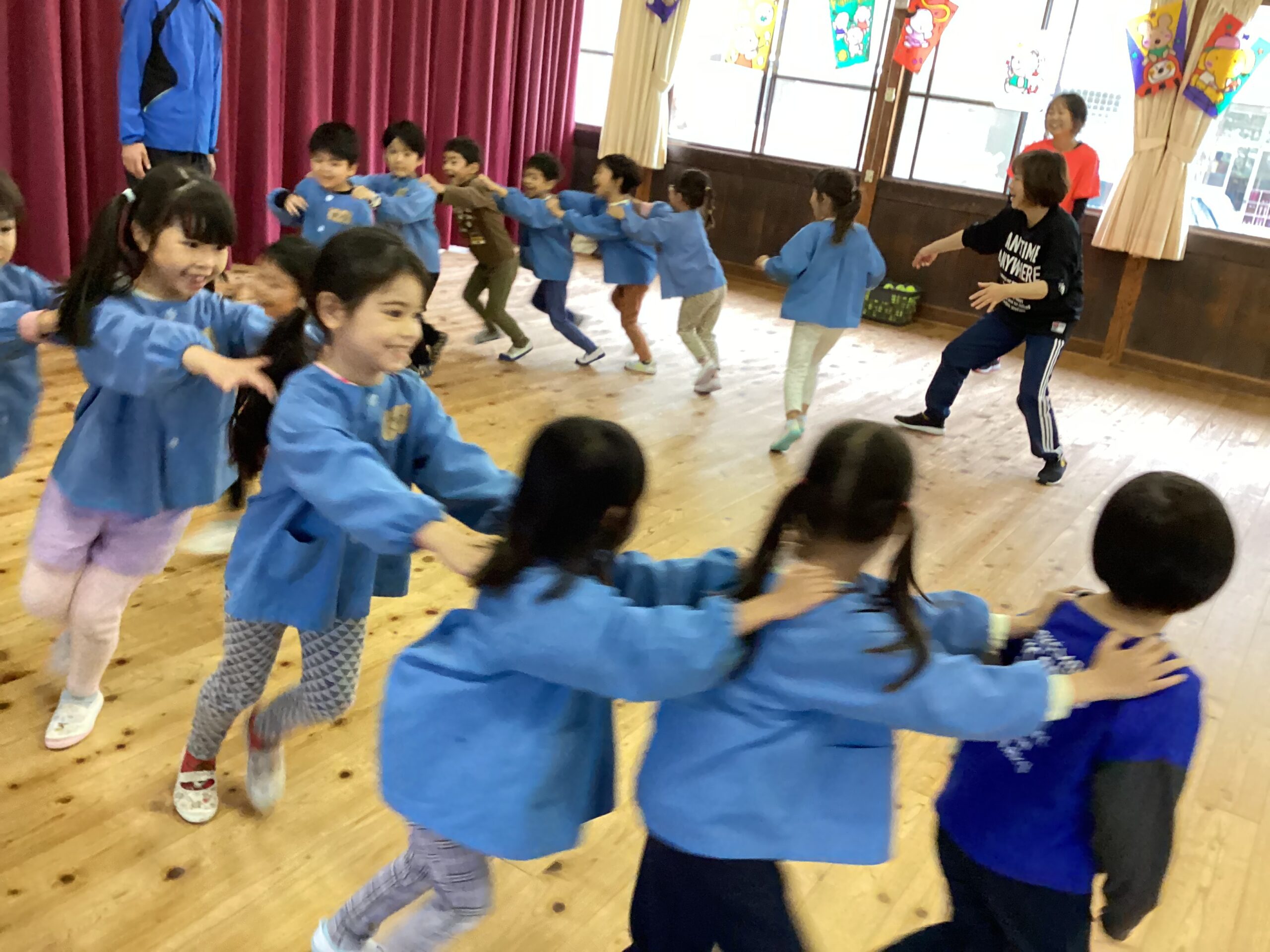 先日、講師の福永有貴さんの指導で年長児がコーディネーショントレーニングを体験しました。 「コーディネーショントレーニングはどんなことするのかな?」と楽しみにしていた子どもたち。 まずは準備体操、まねっこなど。 一人一つのテニスボール。うまくキャッチできるかな。転がってしまうよ~ フープでもテニスボールをキャッチ。 ムカデになって後ろの子をタッチ。なかなかむずかしい。 あー楽しかった。もっとしたいな。 ありがとうございました。