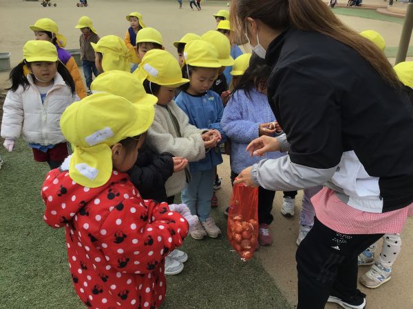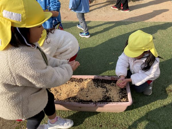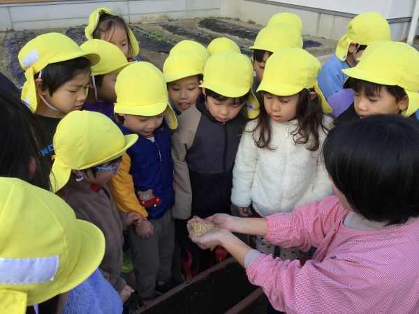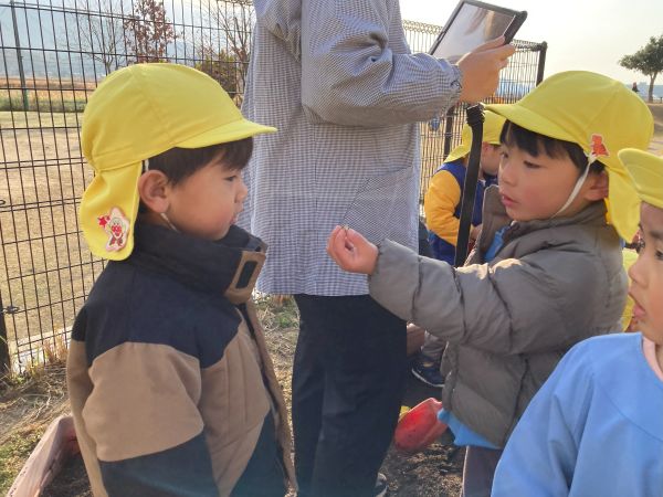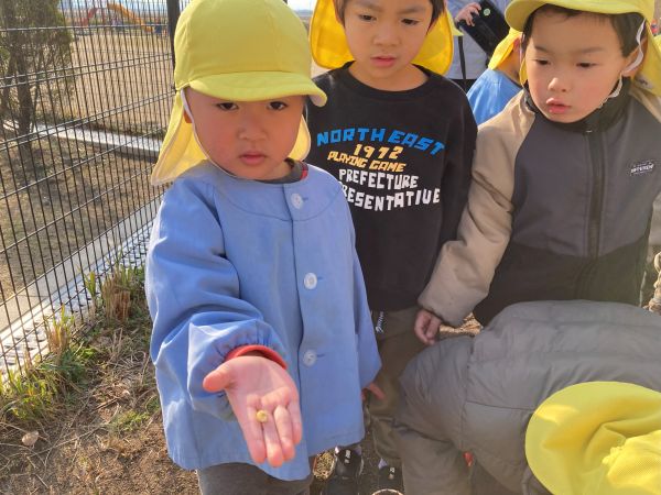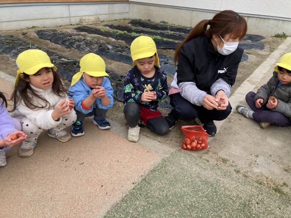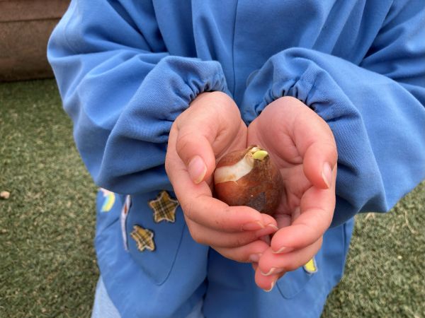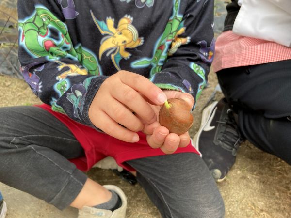 先生から、「これは、ちゅうりっぷの球根だよ」と、教えてもらうと、「へぇ~🫥」と、興味津々、さらに、観察が始まりました。