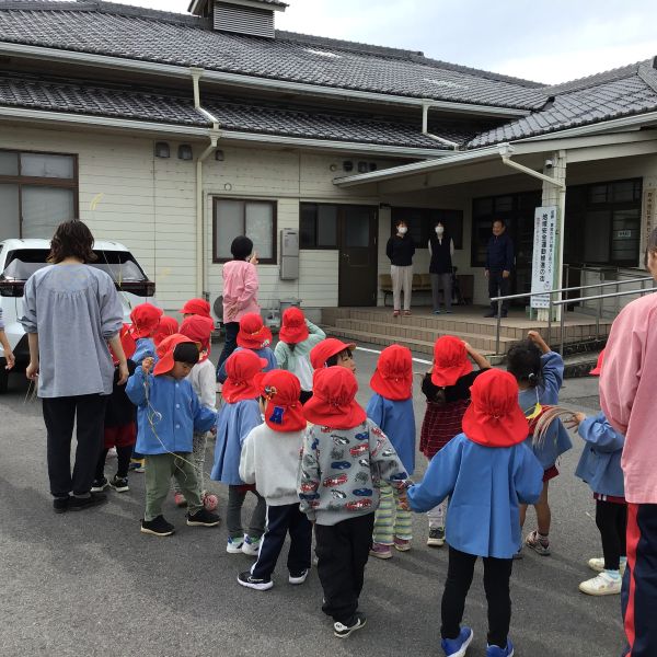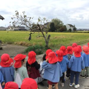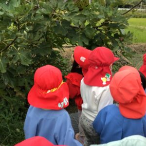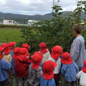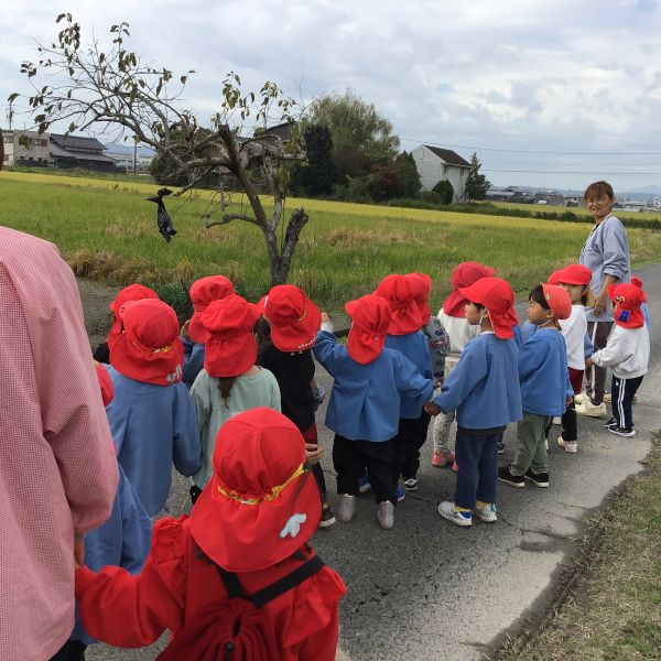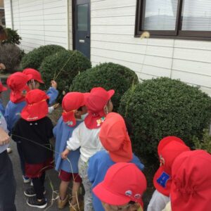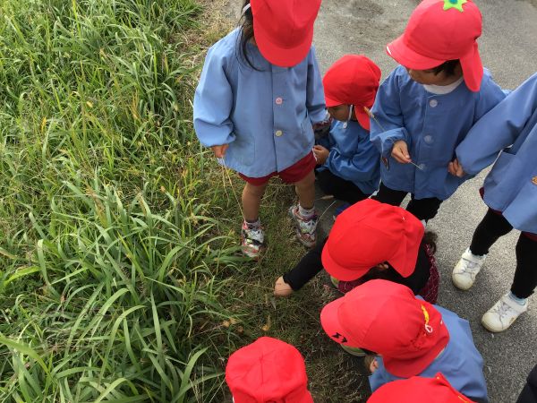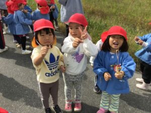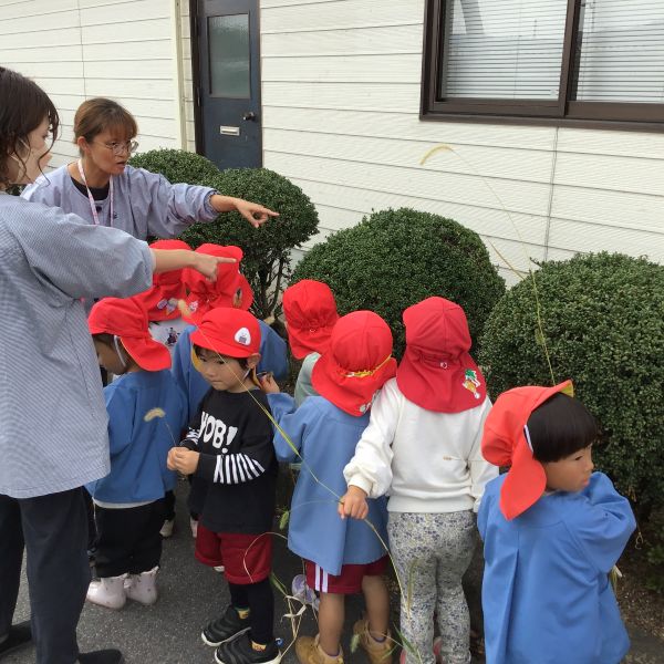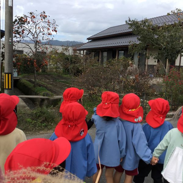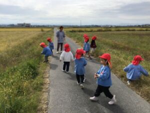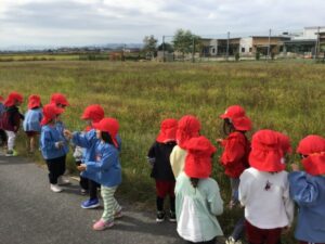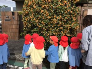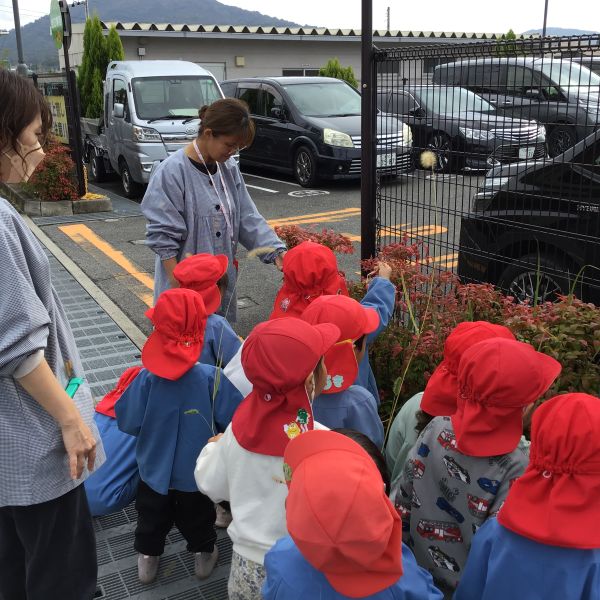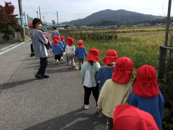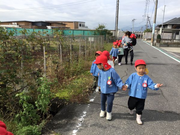 ~今日の散歩は、「きのこ」や「ススキ」「キンモクセイ」「柿」など、秋の自然をたくさん見つけることができました。子どもたちは、前回の散歩を思い出し、「きのこ」を探したり、以前はいっぱい実っていた柿がなくなっているいことに気づいたり・・・と、今日も新たな発見がいっぱいでした。近所の方に声をかけていただいたり、市民センターの方との会話を楽しんだりと、地域の方々にやさしく見守られながら、今日も散歩を楽しみました🤗🤗🤗~