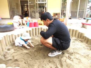 大好きな砂場では、抱っこしてもらわなくても大丈夫。「砂、サラサラやなあ」大好きなパパが優しく声をかけてくれています。自分がしていることを見てくれている、思っていることを言葉にしてくれるパパやママ(ご家族)の存在は子どもにとって、大きな安心につながります。