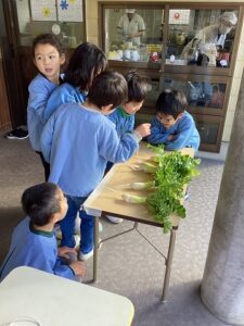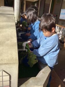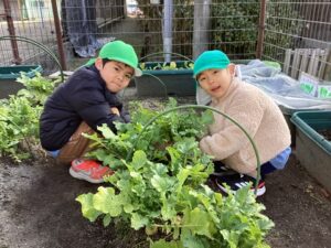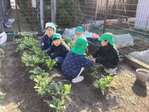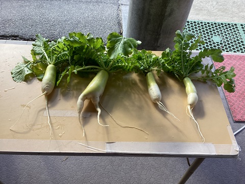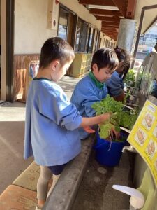 園庭で育てた大根がおおきくなりました。 年長児が収穫しました。 「どの大根ぬこかな?」 「これが大きいよ」 「きれいに洗おう」 「今日の給食に入れてもらおう」 「いろんな形があるね」 その日の給食でお汁にしていただきました。