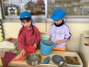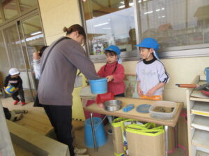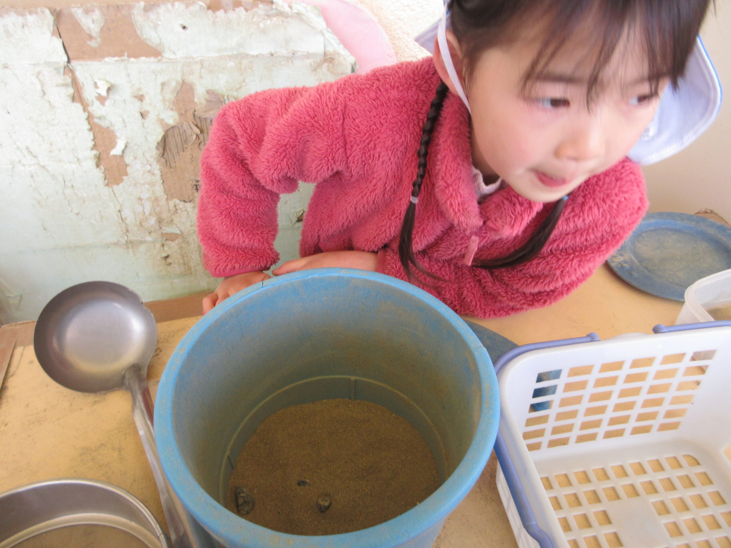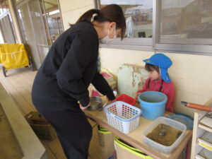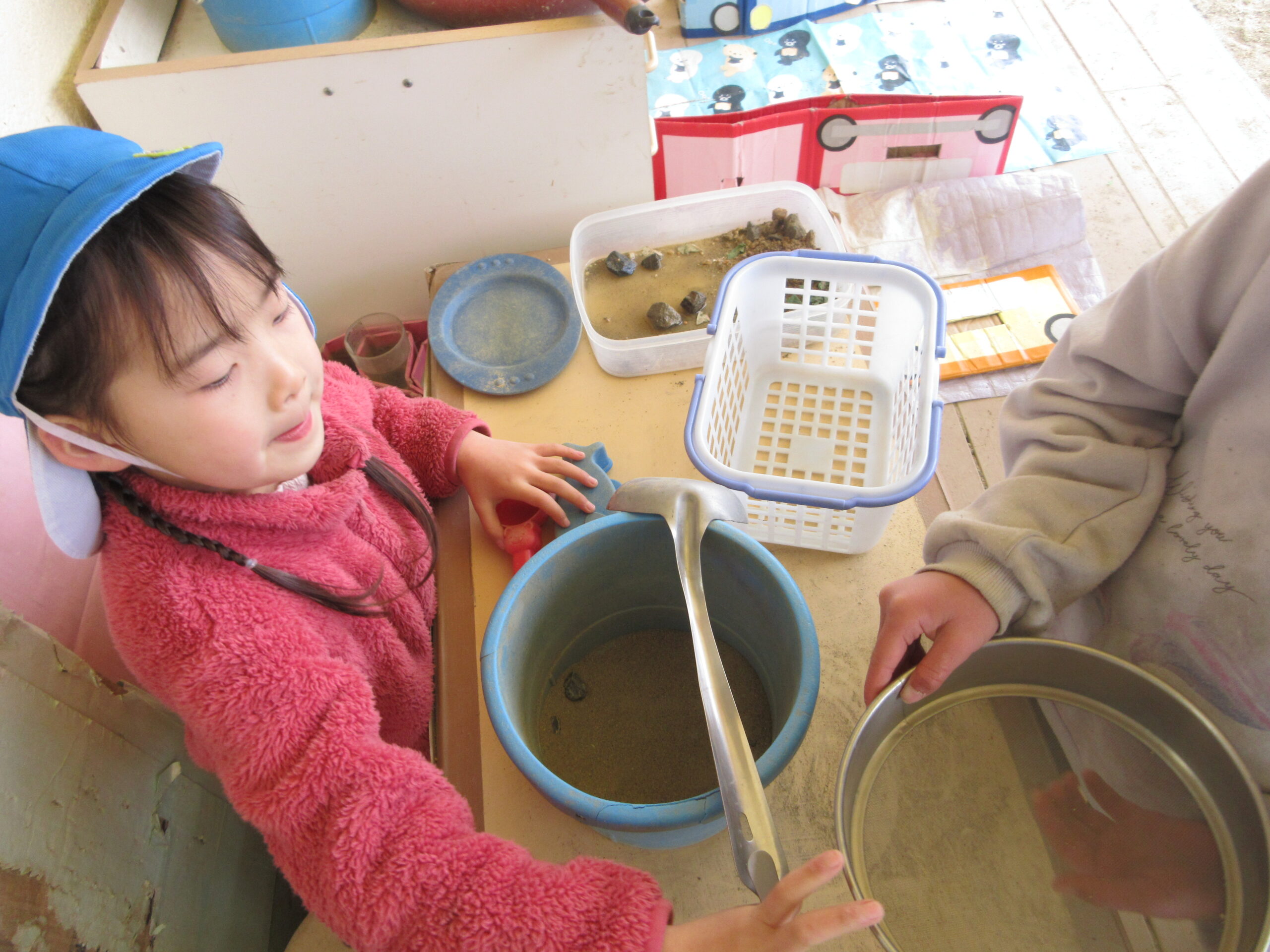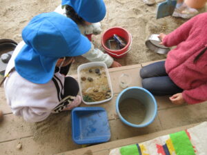 片付けの時、もう一度ツルツルの石を触らせてもらおうと思い、声をかけると「もうないよ」「すてた」とあっさり言われました。そうです。子どもってそうなんです。ふと、見つけた面白いもの、素敵なものを残す子もいれば、惜しげもなく手放す子もいるのです。子どもの世界はおもしろい。